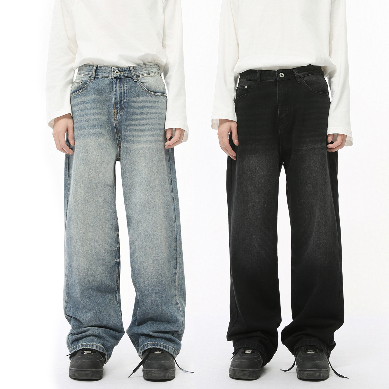 MTLCLOTHESメンズウェア | アメリカンハイストリートレトロウォッシュ加工ストレートルーズフィット通勤用ブラックグレーデニムパンツ