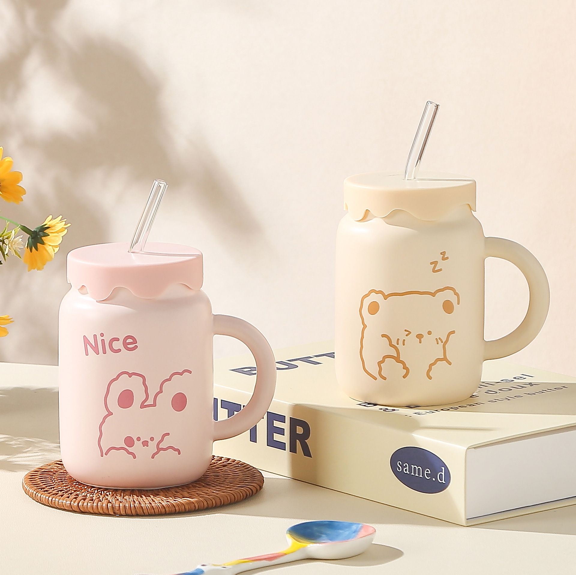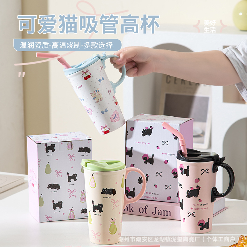猫のマグカップ 大容量 ストロー付き 水筒 蓋付き 陶器製カップ 高品質 誕生日プレゼント お土産 可愛い