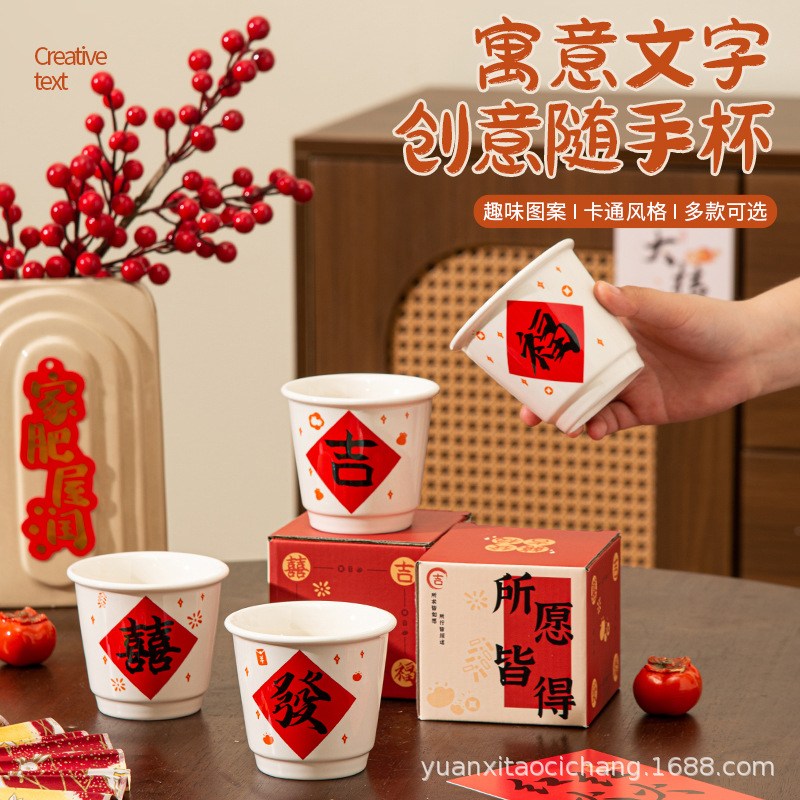 中国風陶器の携帯用カップ、文字入りで縁起の良いおめでたいコーヒーカップ、水飲みカップ、お土産ギフトカップ、幸運カップ