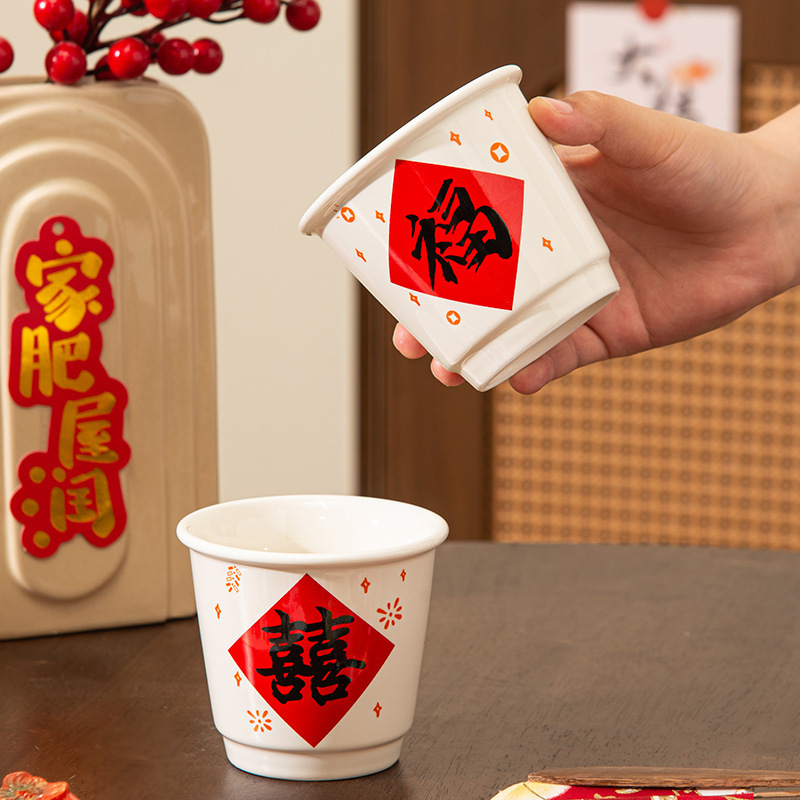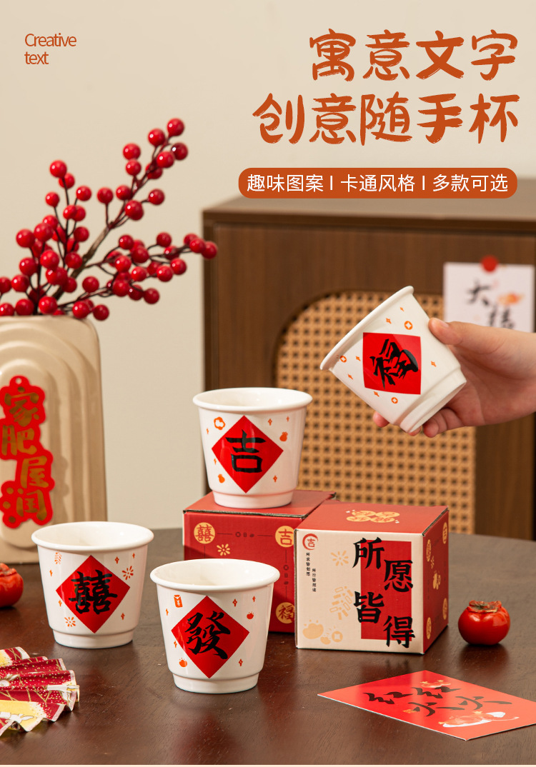 新年のお祝いの文字の陶磁器の手作りの杯の新しい中国式のコーヒーの杯の朝食の牛乳の杯のお土産の贈り物