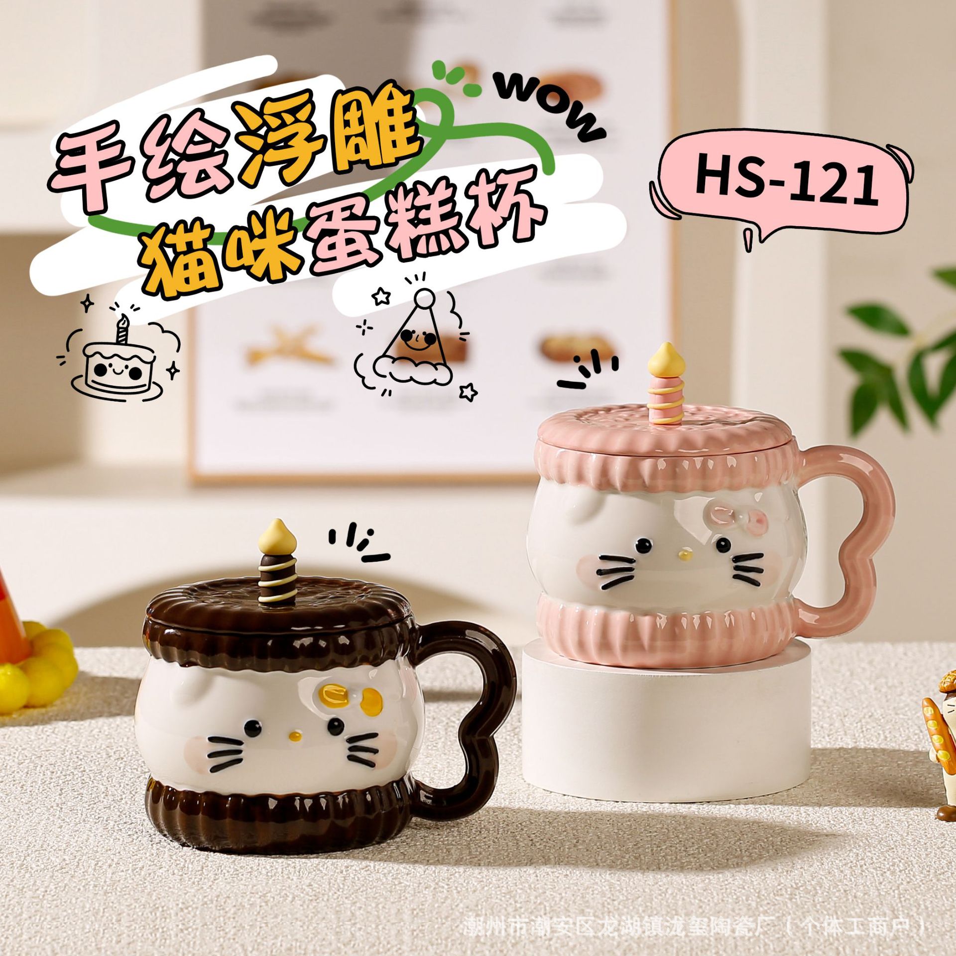 手描きのレリーフ猫セラミックカップ、クリエイティブな漫画マグカップ、寮の家庭用蓋付きウォーターカップ、見栄えの良いお土産