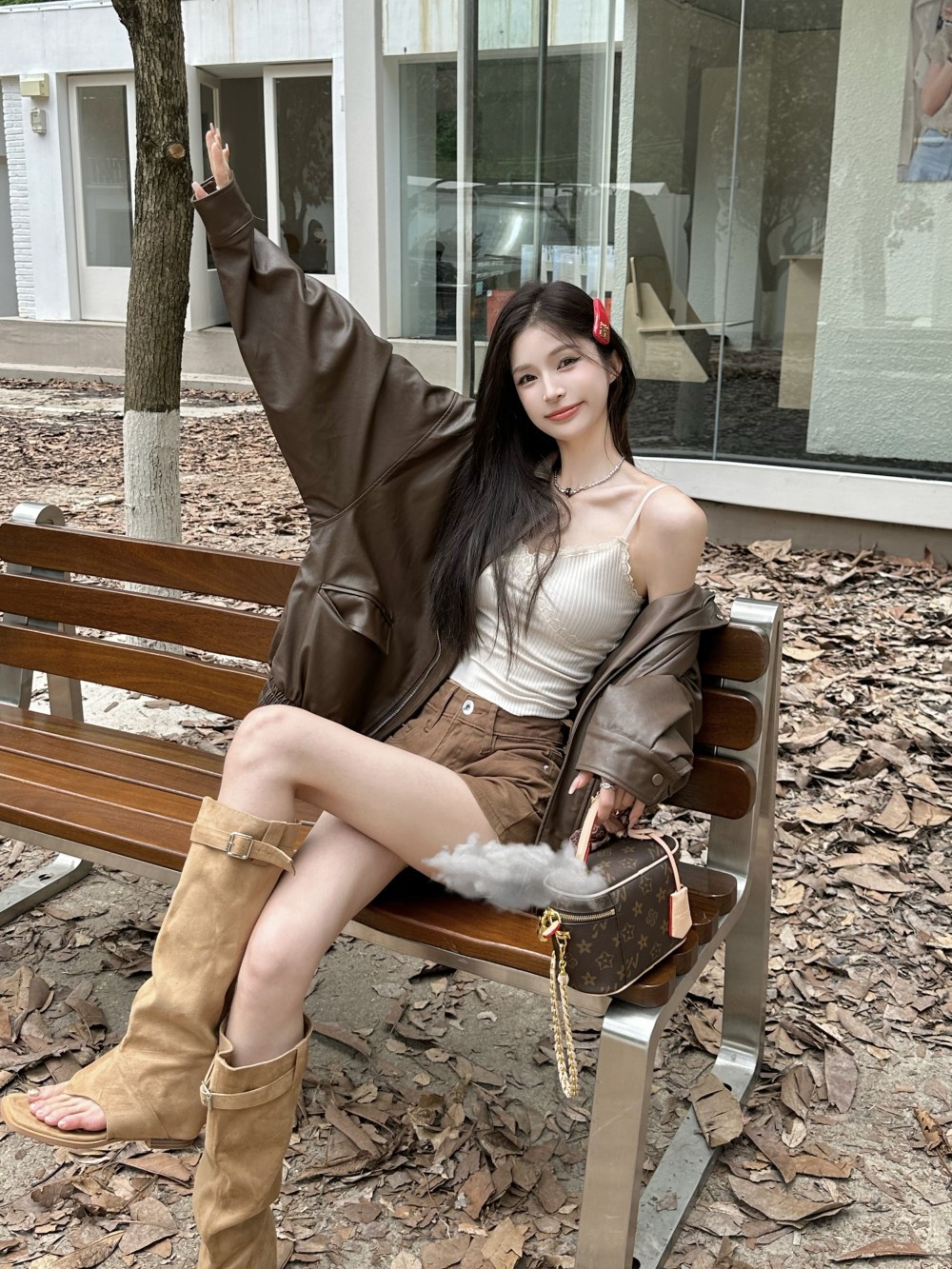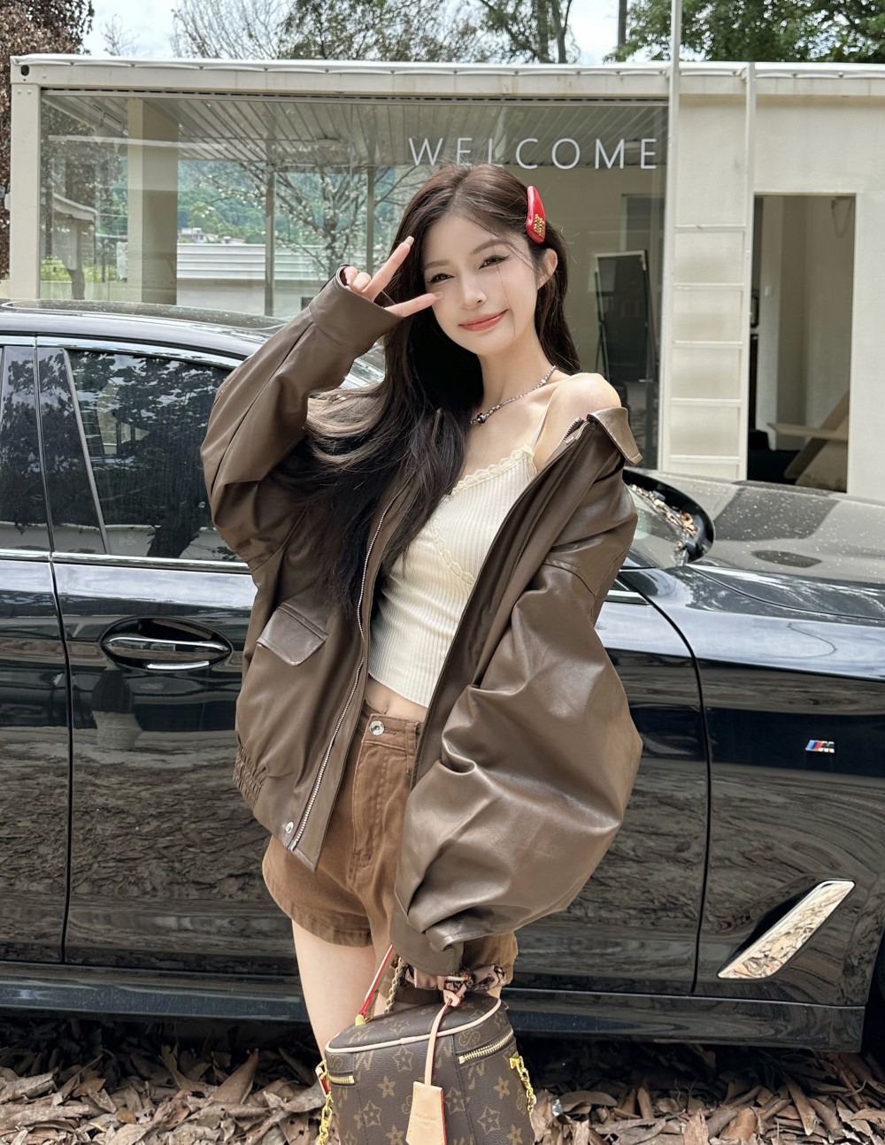 茶色の革の服のコートの女性の秋の韓国版2025新型の辛辣な少女の機関車のゆったりした長袖のジャケットの上着