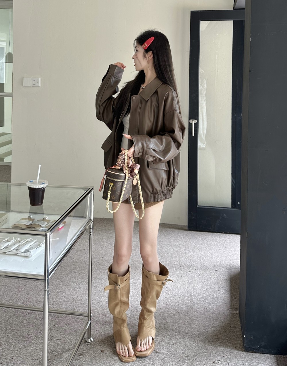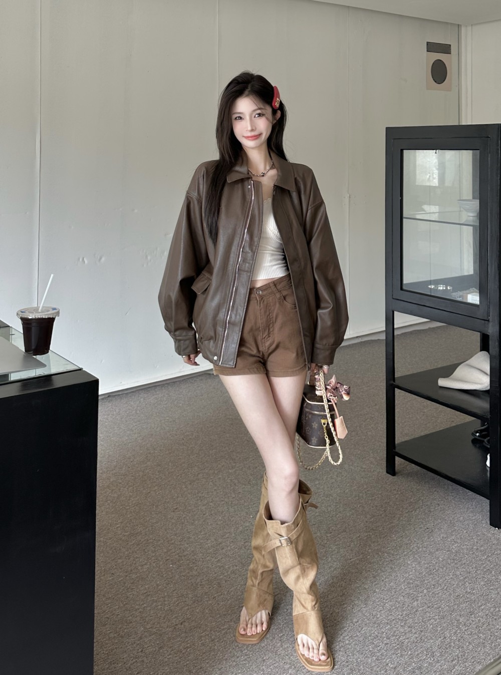 ブラウンPUレザージャケット レディース 2025春秋新作 ゆったり香港風 小柄さん向け ショート丈ジャケット バイクジャケット