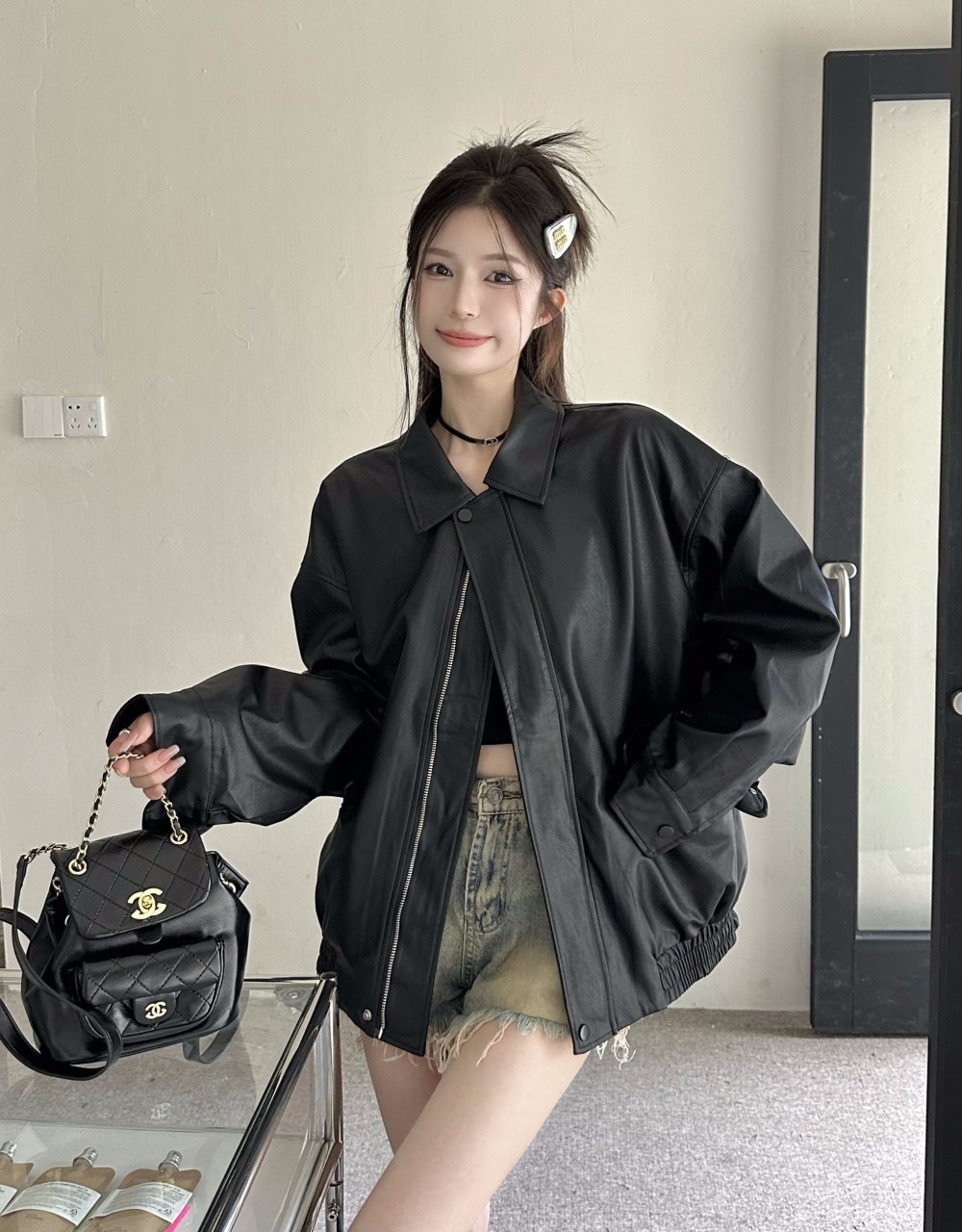 黑色复古机车翻领pu皮衣外套女酷飒风爆款2025春秋新款皮夹克上衣