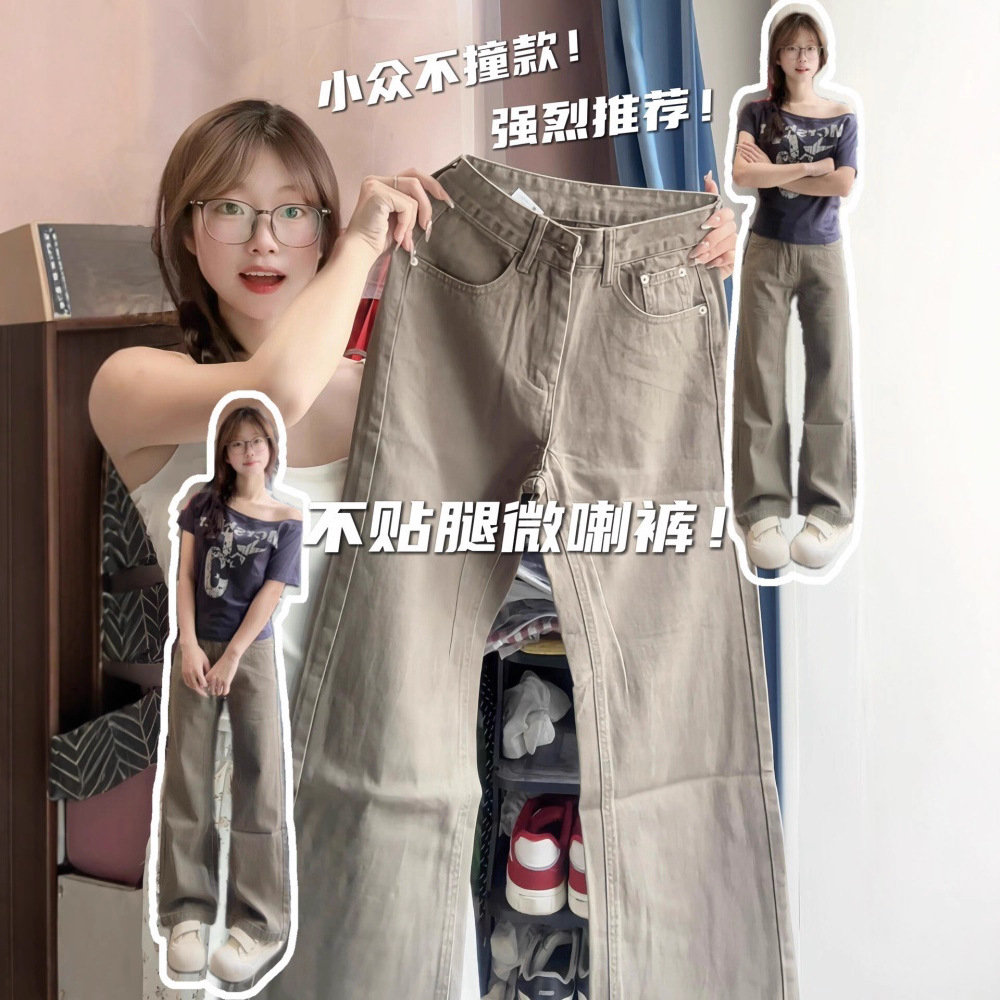 大码美式卡其色窄版直筒微喇牛仔裤女秋季宽松不贴腿阔腿拖地长裤
