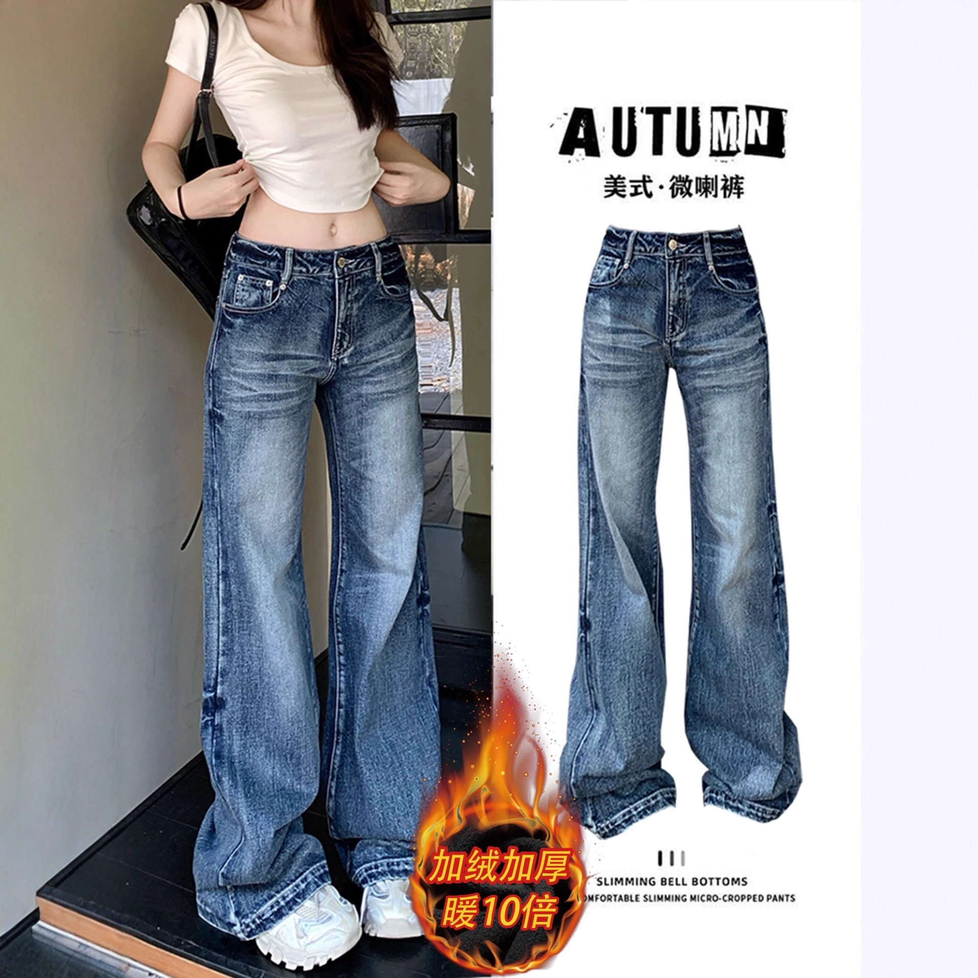 小柄なアメリカのレトロなラッパのジーパンの女性の秋冬の高腰はゆったりしていて、やせていません。