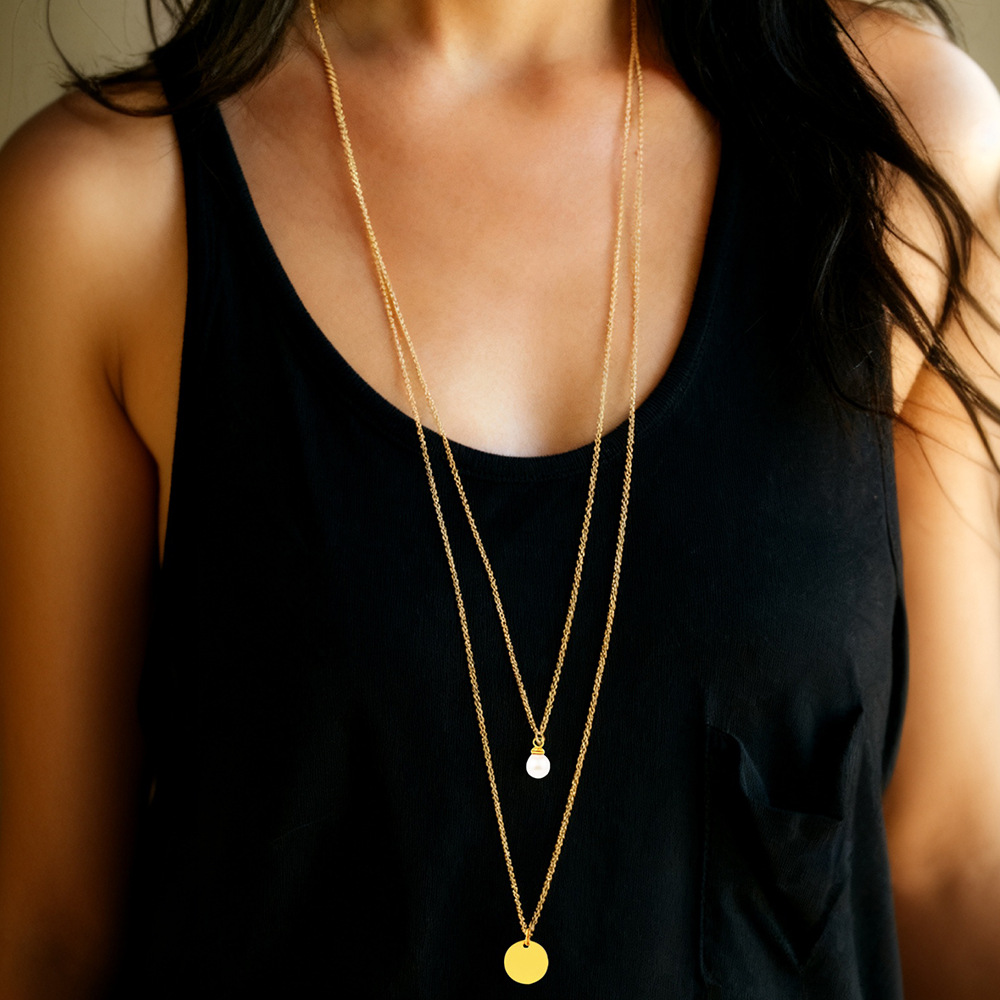 欧美跨境新款仿珍珠圆片吊坠双层长款项链女不锈钢轻奢时尚毛衣链