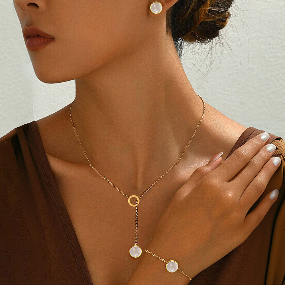 不锈钢圆片吊坠可调节锁骨链手链耳钉套装女士设计感气质小众饰品