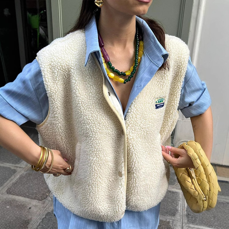 ノースリーブショート丈ファーベスト 欧米風クロスボーダー2024 ゆったりダブルポケットシングルボタン多ボタントップス カジュアル万能