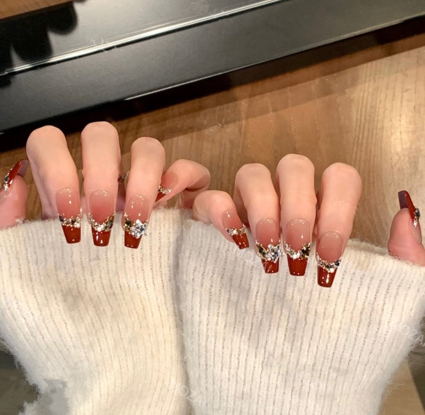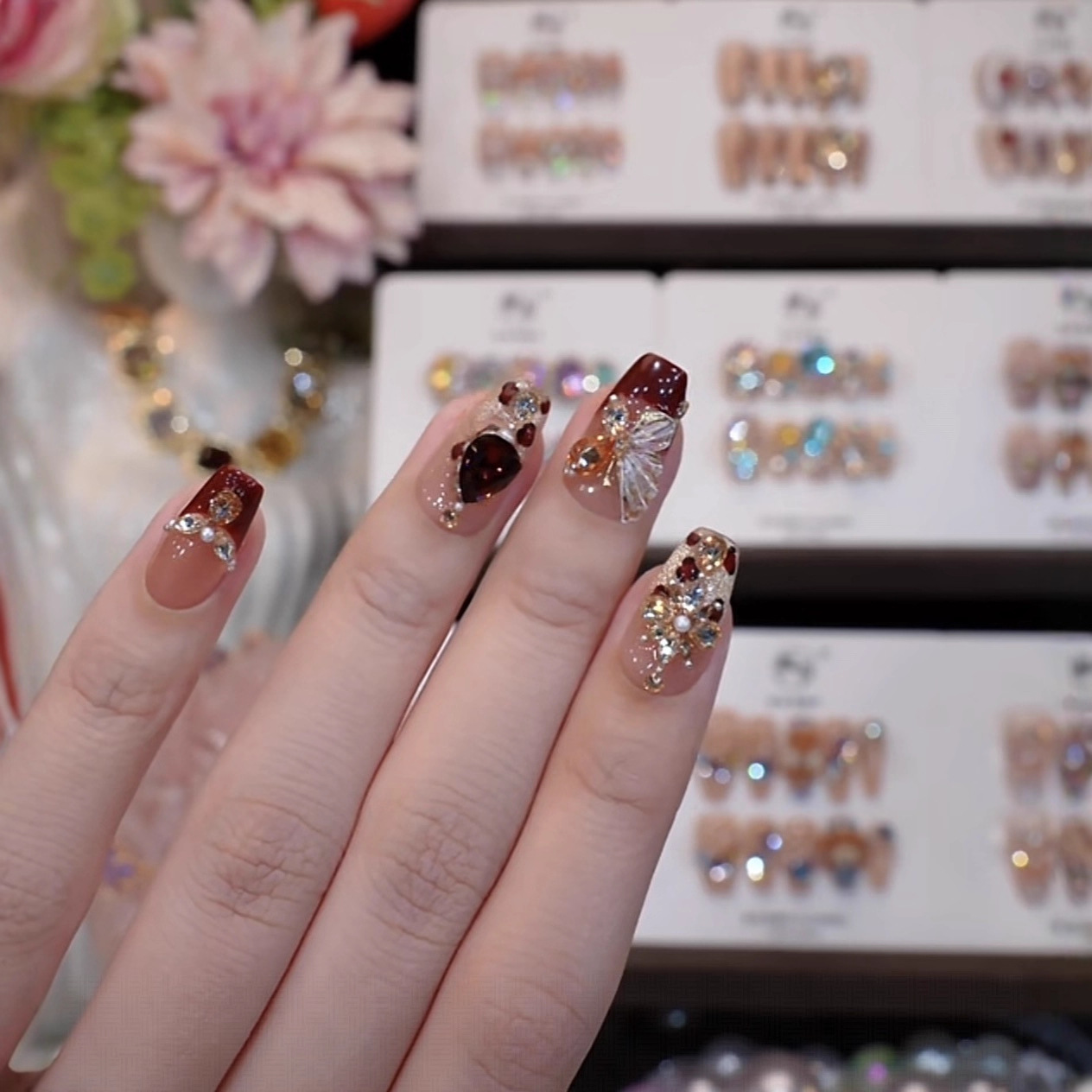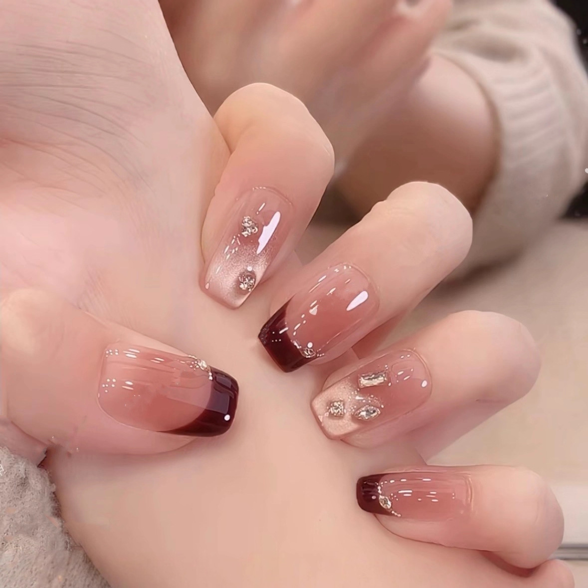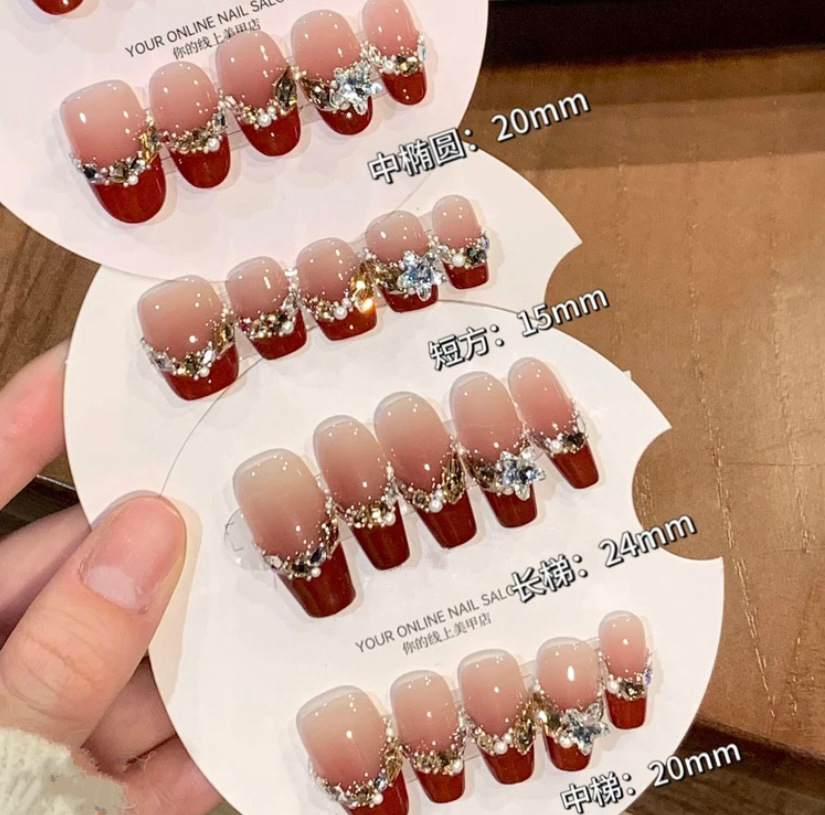 【红酒杯】新款纯手工穿戴甲红色法式锆石光疗高级显白纯手作美甲
