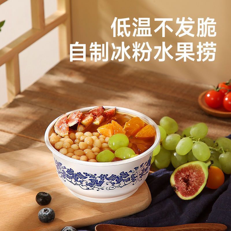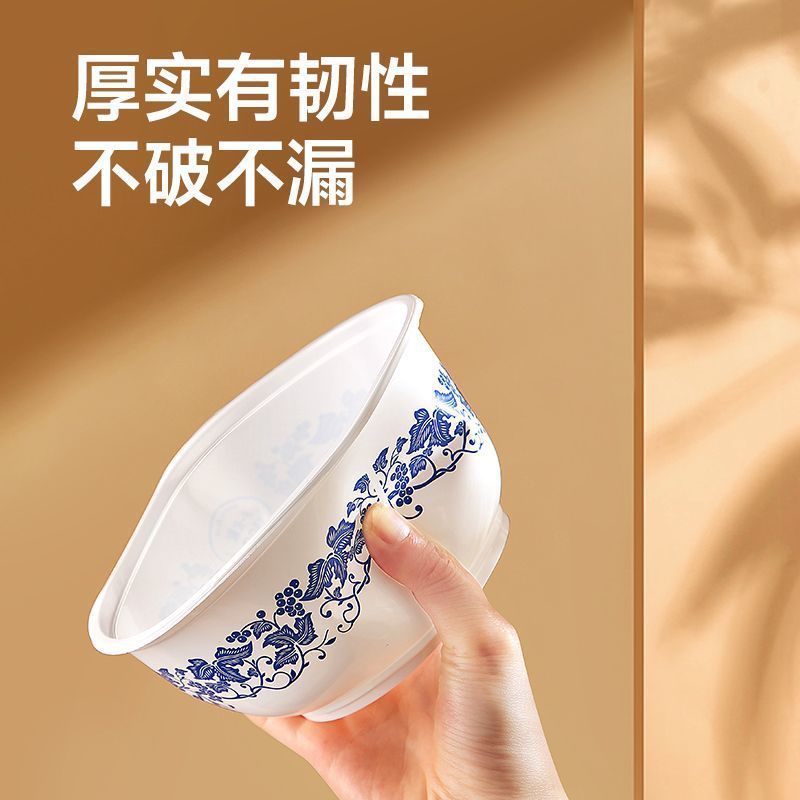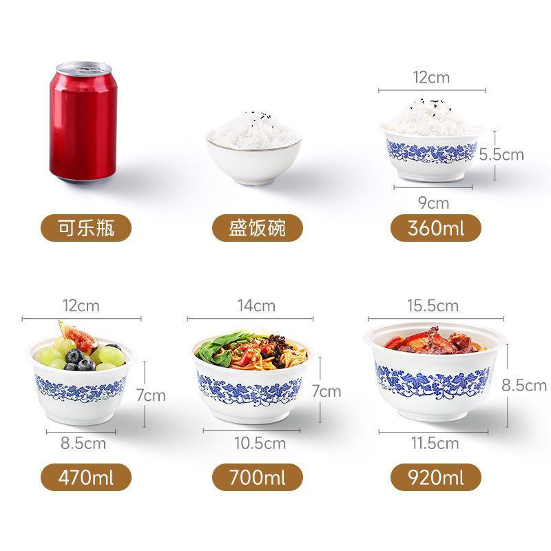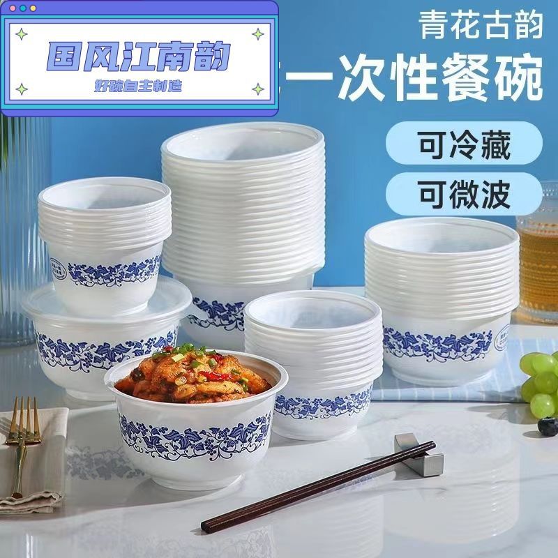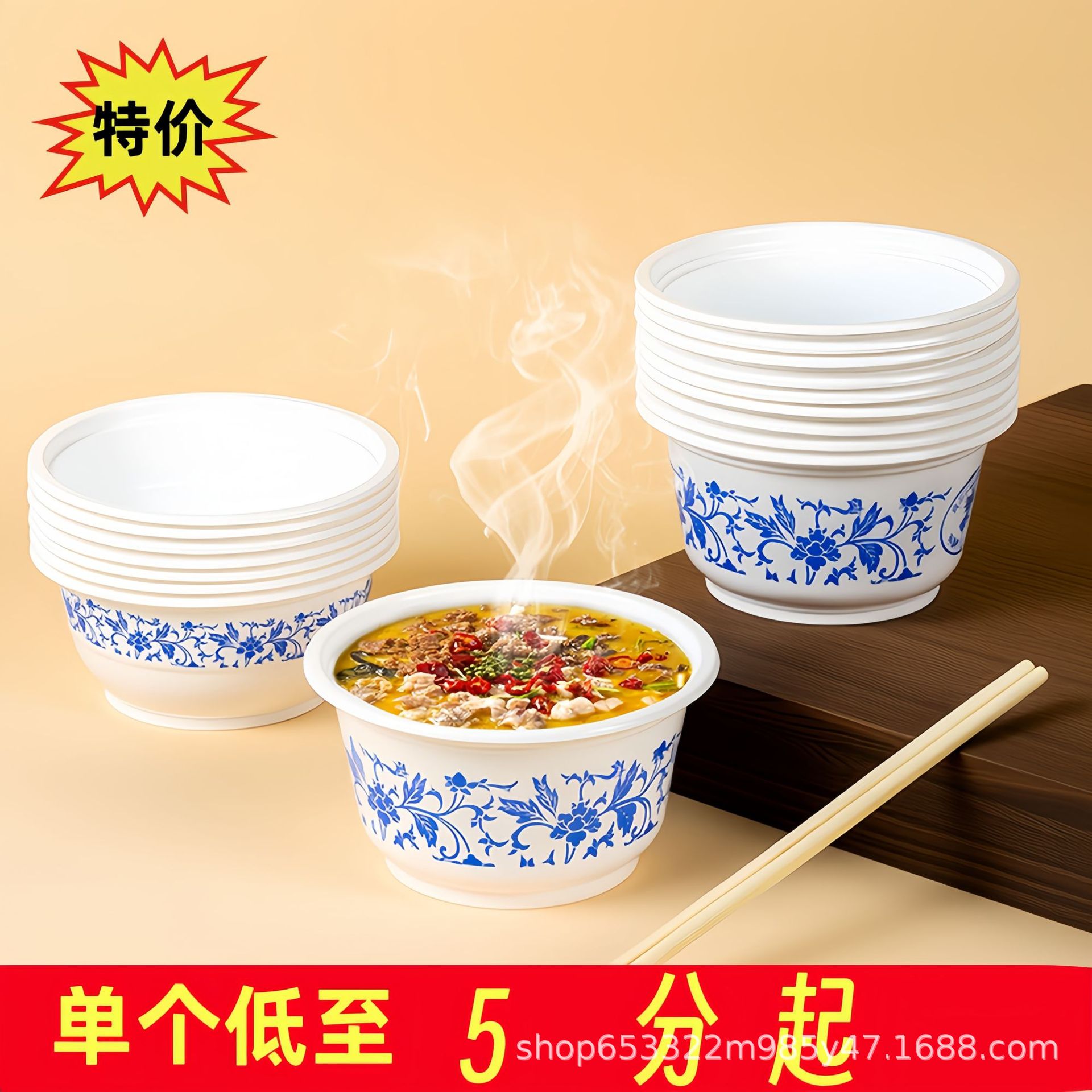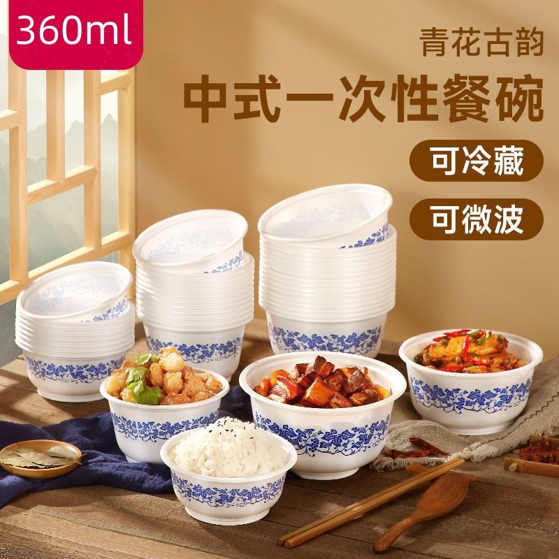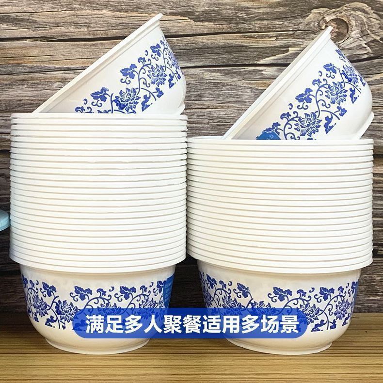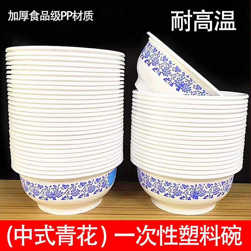 一次性餐碗青花纹碗中式圆形打包碗饭碗汤碗加厚塑料耐高温硬质碗
