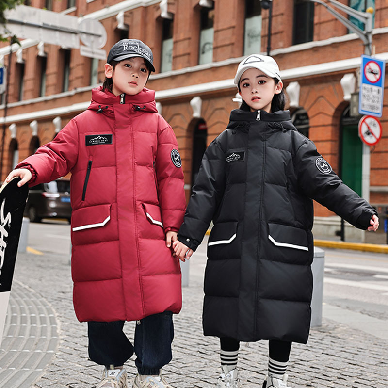 新しい子供のダウンジャケットの男の子の中の長いタイプの冬の白鴨の子供の中の大きい子供は膝を越えて保温のコートを厚くします。