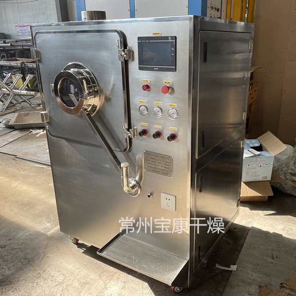 BG系列高效包衣机是将被包衣的片 芯在包衣机的滚筒内通过可编程序控制系统的控制,使之不断的、连续地、重复地做出复杂的轨迹运动,在运动过程中,由控制系统进行可编程序控制,按工艺顺序 及参数的要求,将介质经喷枪自动地以雾状喷洒在片芯的表面,同时由热风柜提供经10万级过滤的洁净热空气,穿透片芯空隙层,片芯表面已喷洒的介质和热空气 充分接触并逐步干燥,废气由滚筒底部经风道由排风机经除尘后排放,从而使片芯形成坚固、光滑的表面薄膜。