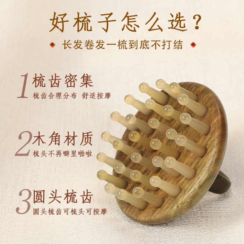 羊角按摩梳绿檀木头部经络28钉圆盘插齿梳指环梳按摩头皮养发