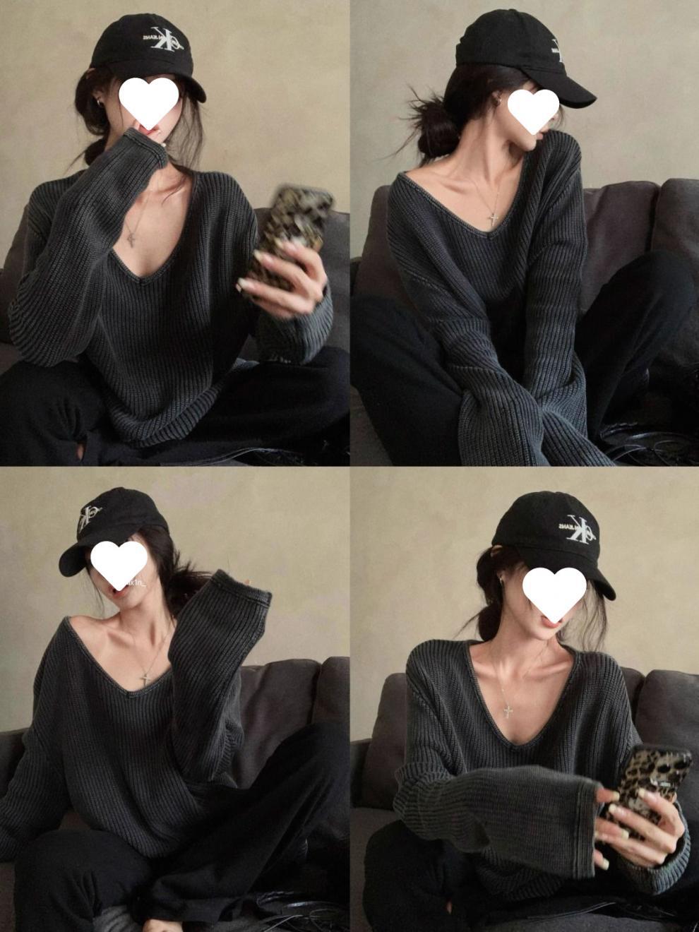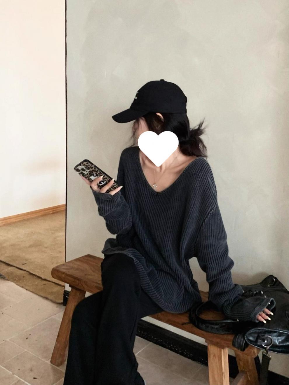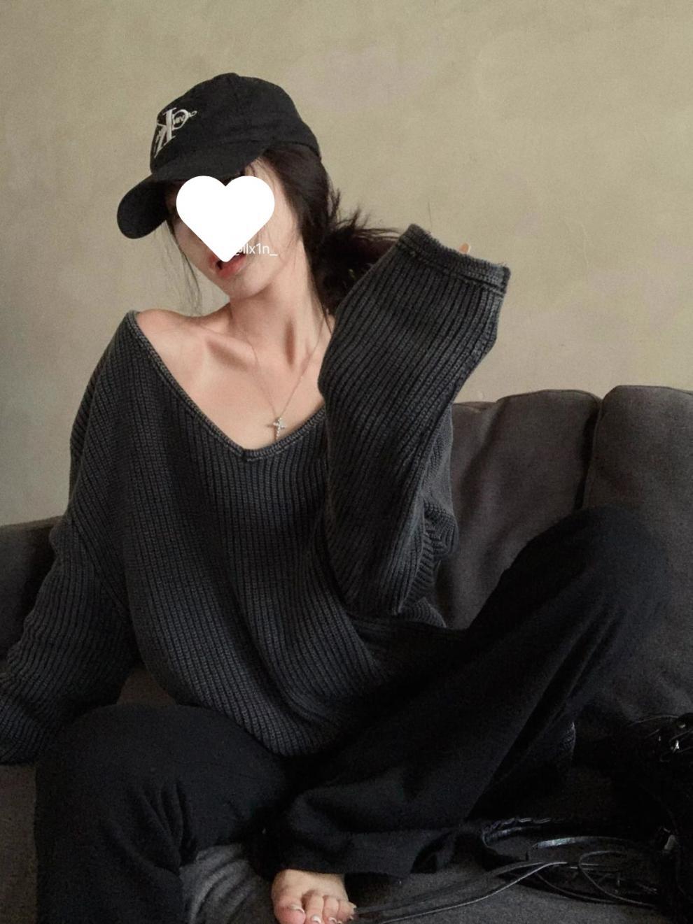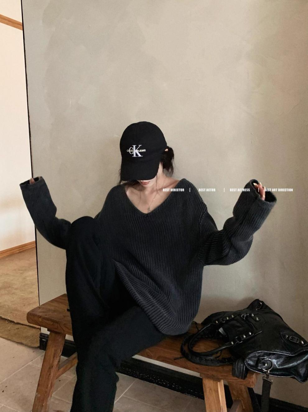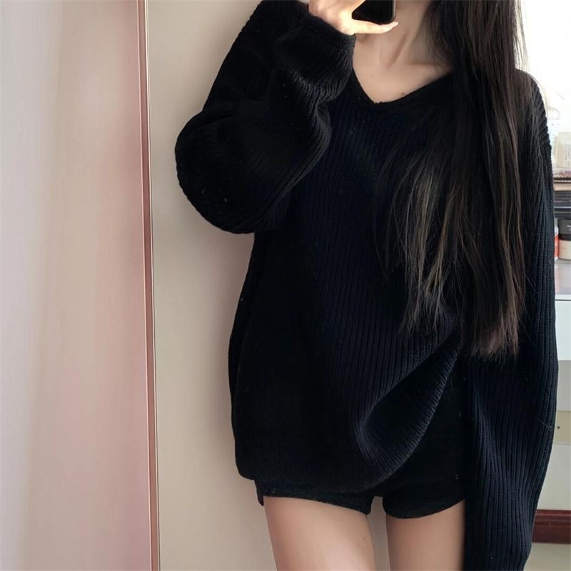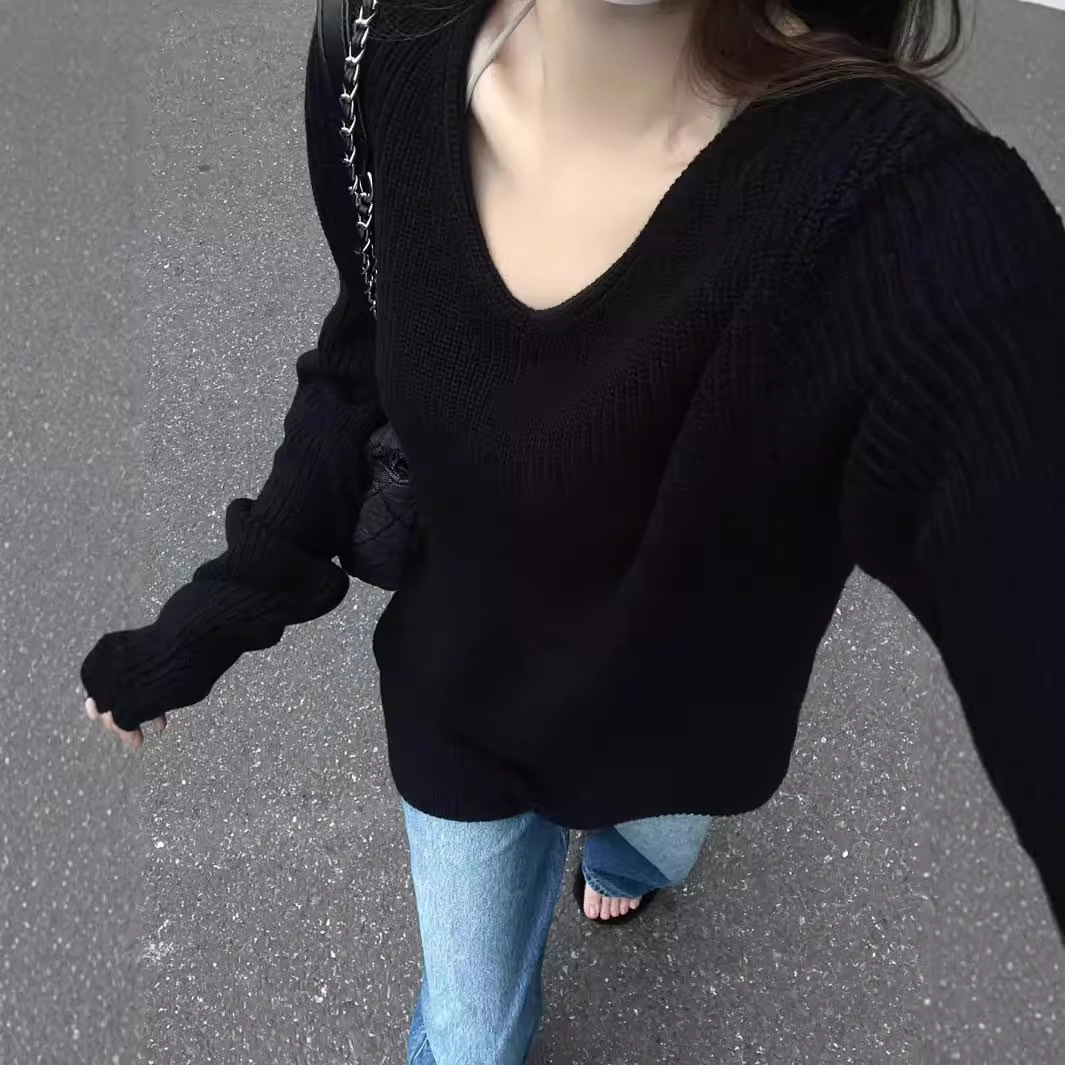 宽松v领黑色毛衣女慵懒风套头针织衫秋冬新款高级感气质ins打底衫