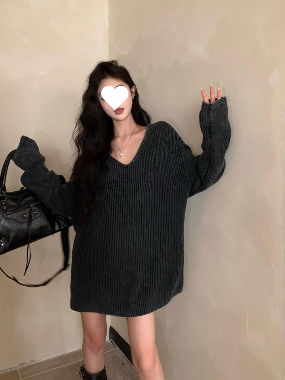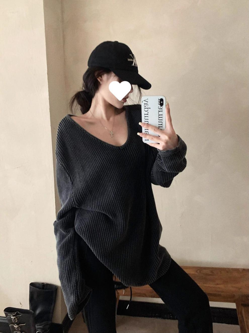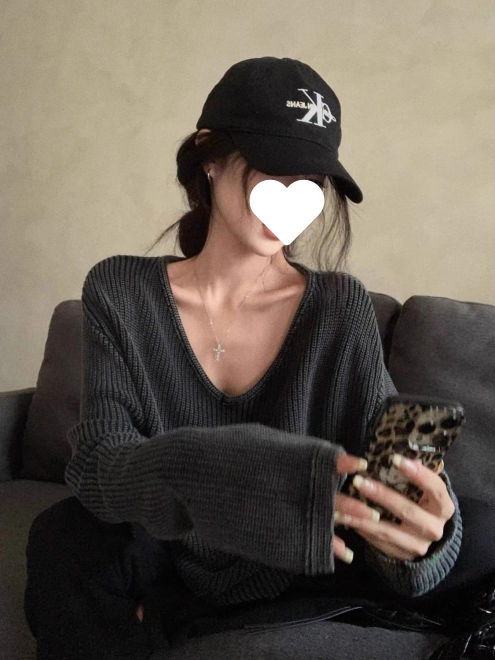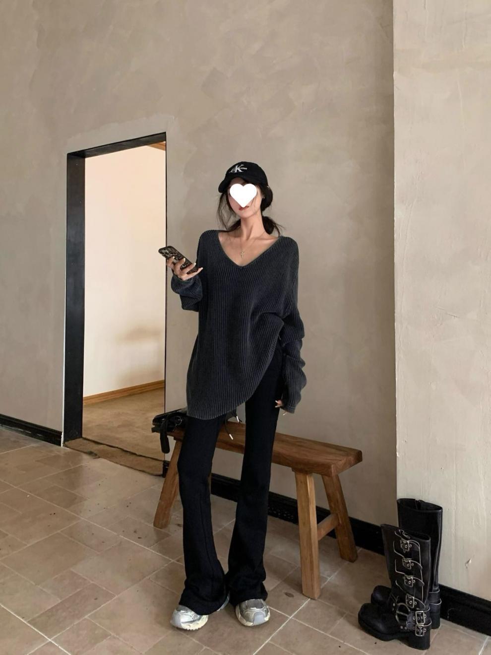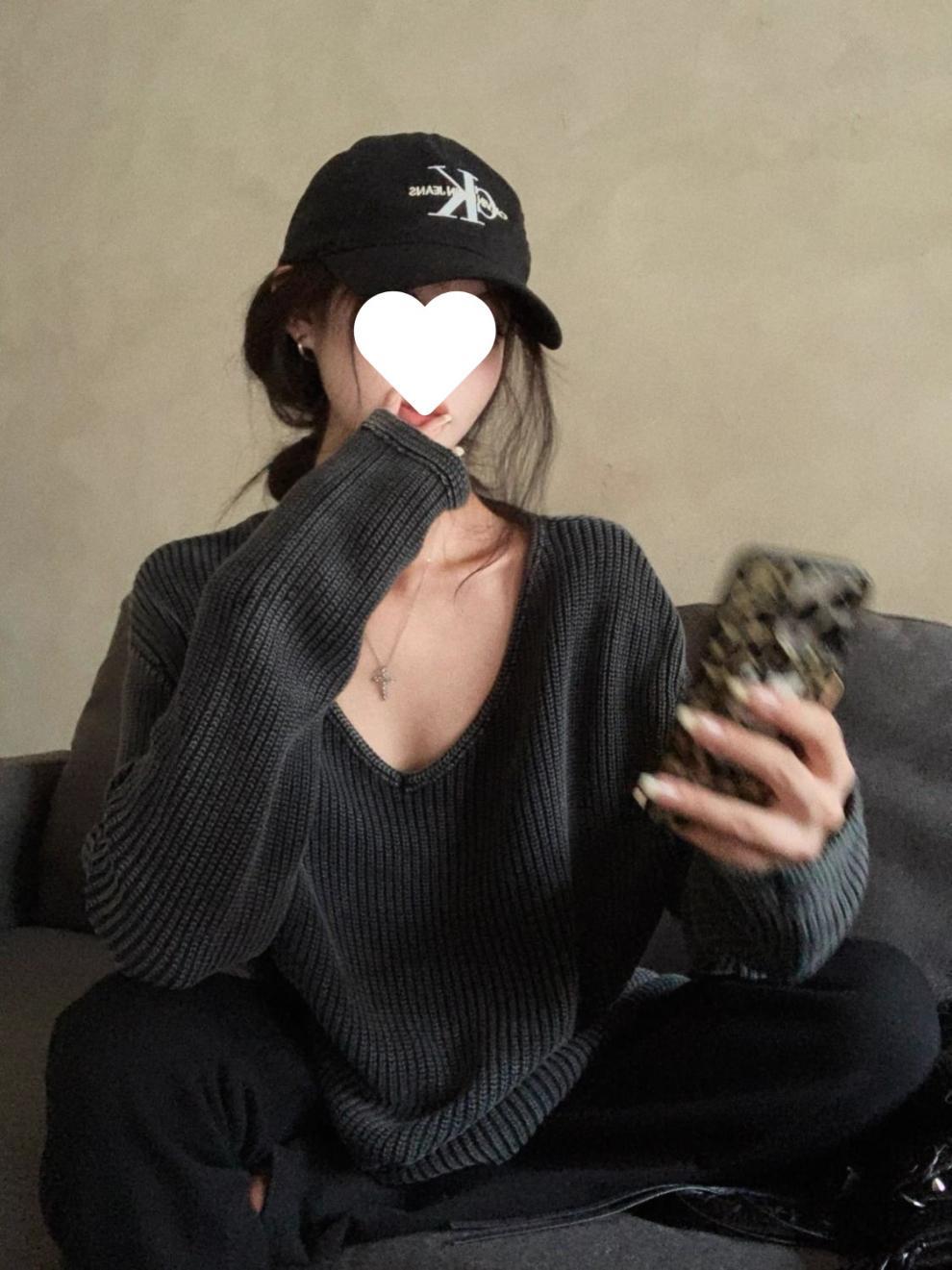 宽松v领黑色毛衣女慵懒风套头针织衫秋冬新款高级感气质ins打底衫