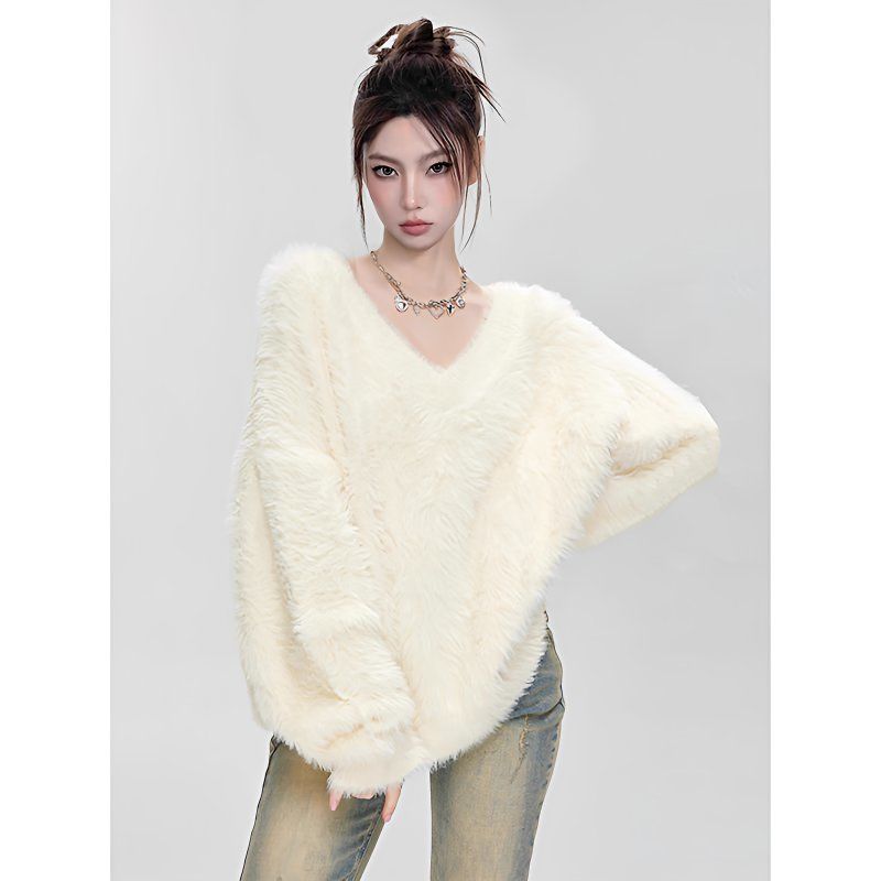 奶fufu白色水貂绒V领套头毛衣女秋冬季加厚内搭宽松慵懒风针织衫