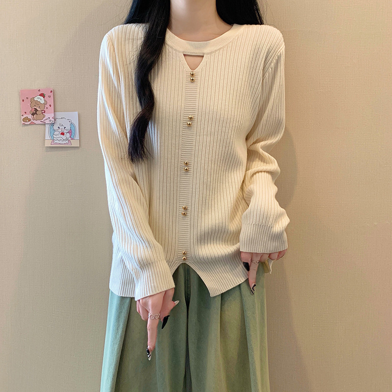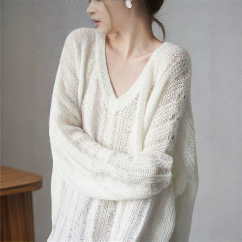 春秋季新款慵懒风针织毛衣女宽松外穿镂空鸡心领休闲显瘦打底衫薄