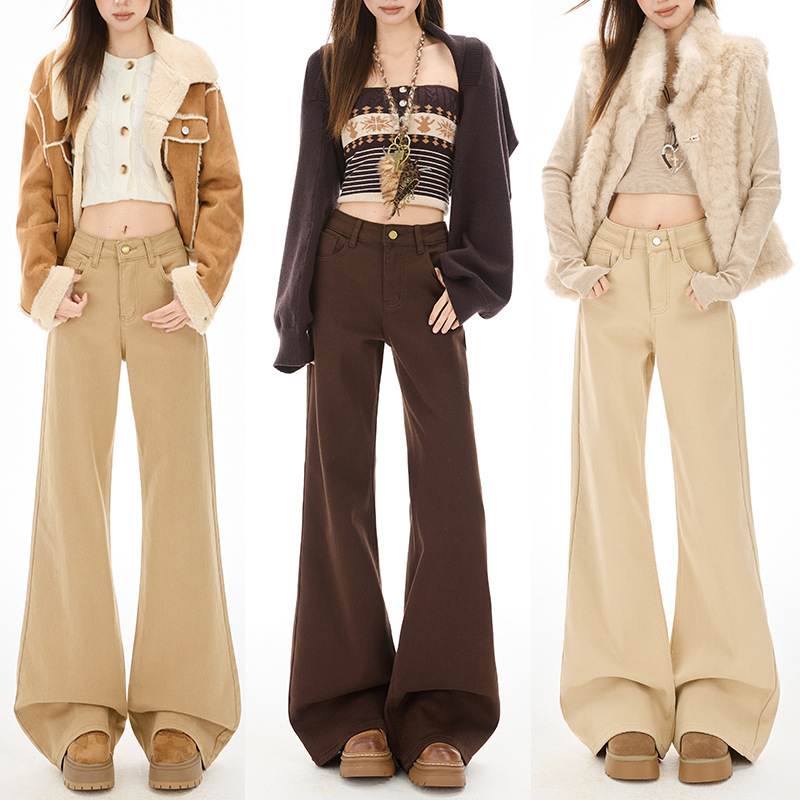 老钱风卡其微喇牛仔裤女冬季低腰弹力显瘦宽松不贴腿弹力拖地长裤