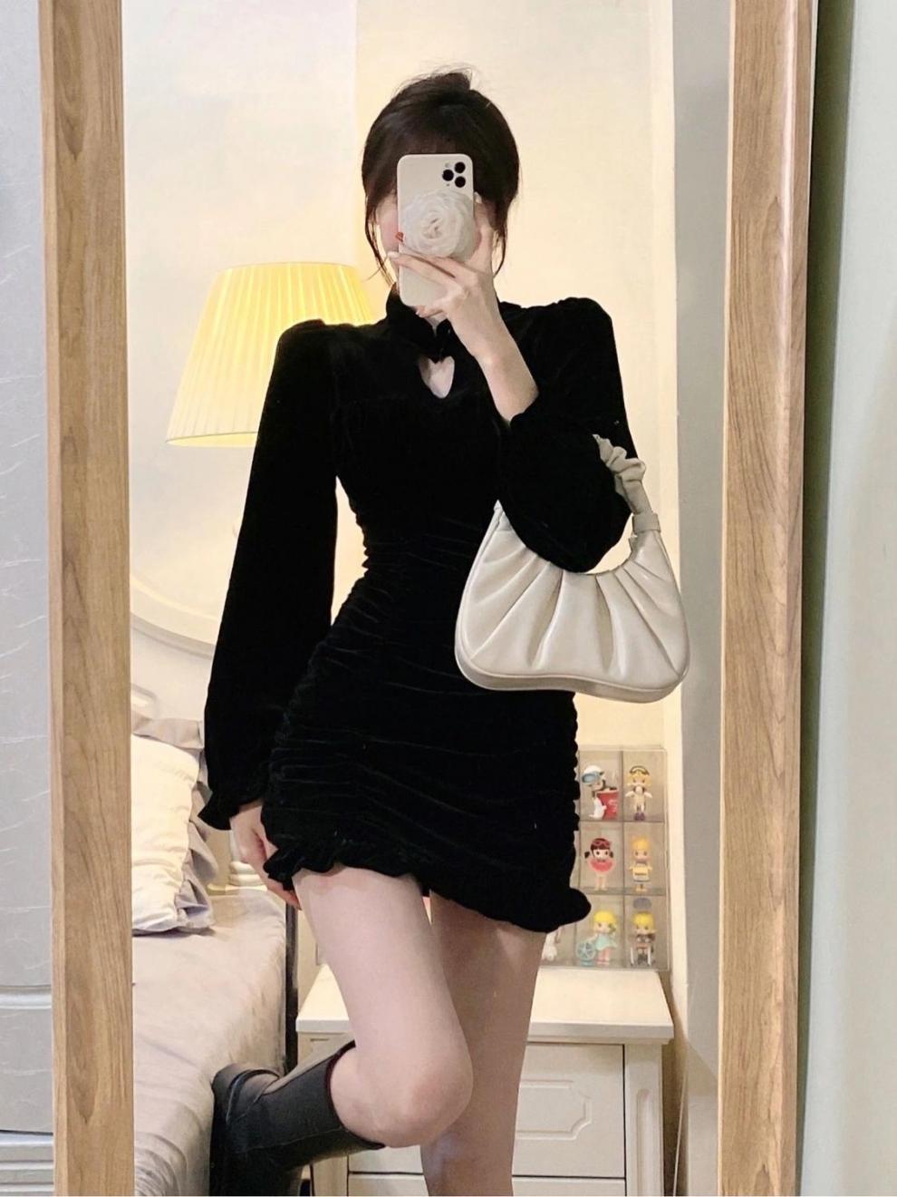 秋の夜のドレスのスカートの女性の宴会の2024の新型のヘボンの小さい黒いスカートの名媛の風の気質は尻のベルベットのワンピースを包みます。