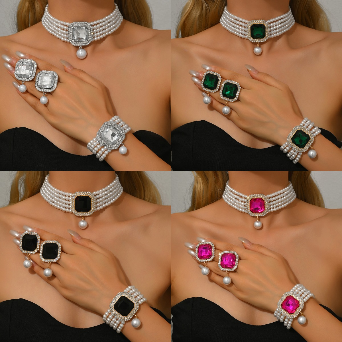 新款外贸大牌珍珠choker颈链跨境新娘多层仿珍珠项链手链耳钉套装