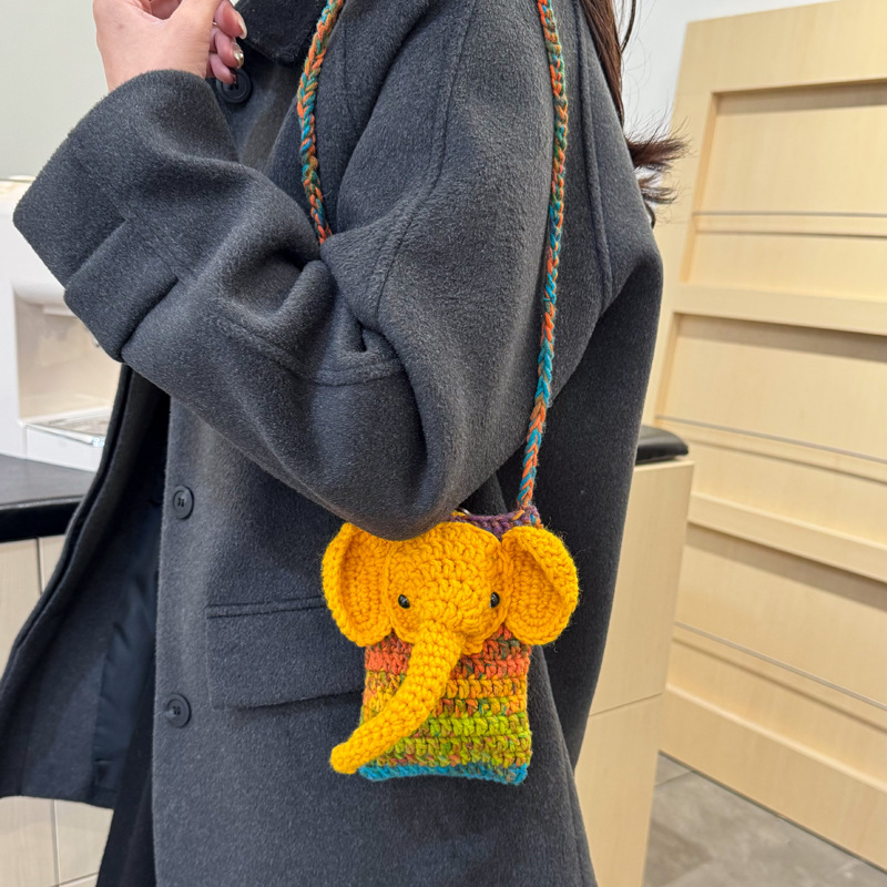 卡通小象手工钩织包成品毛球手机包可爱百搭针织包渐变色毛线包包