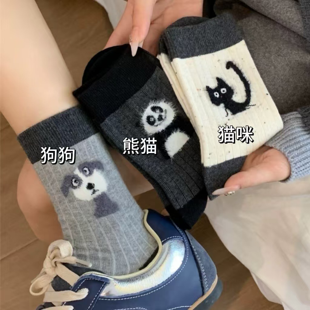 秋冬季袜子女中筒袜灰色点子纱日系植绒长袜可爱动物厂家批发代发