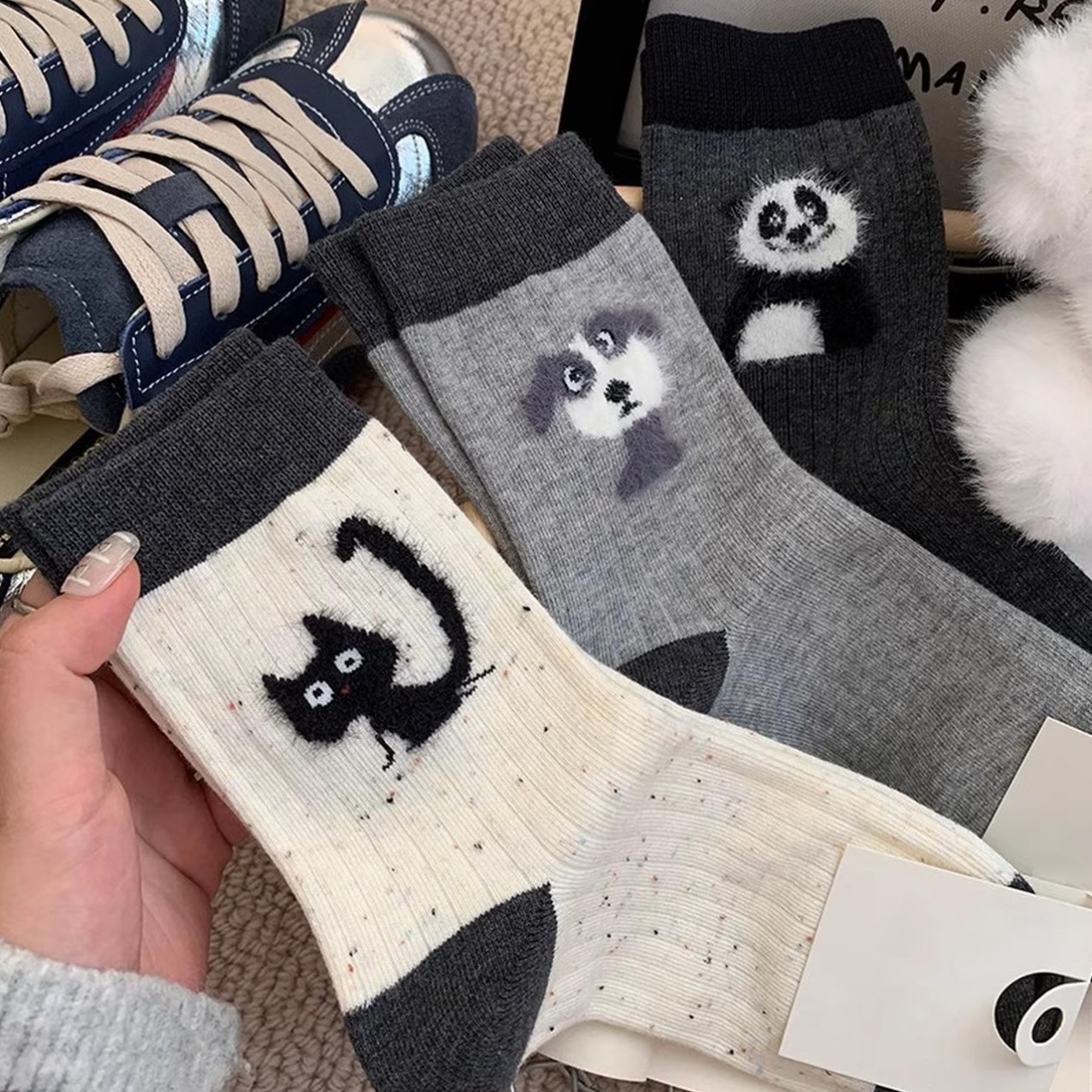 日本のかわいい灰色の靴下の女性のストッキングins潮秋のモデルの漫画の植毛のアイデアの糸の冬のストッキングはかわいいです。