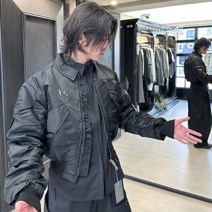 (无铆钉)Thug club 24fw星月金属飞行夹克棉服bomber褶皱外套潮