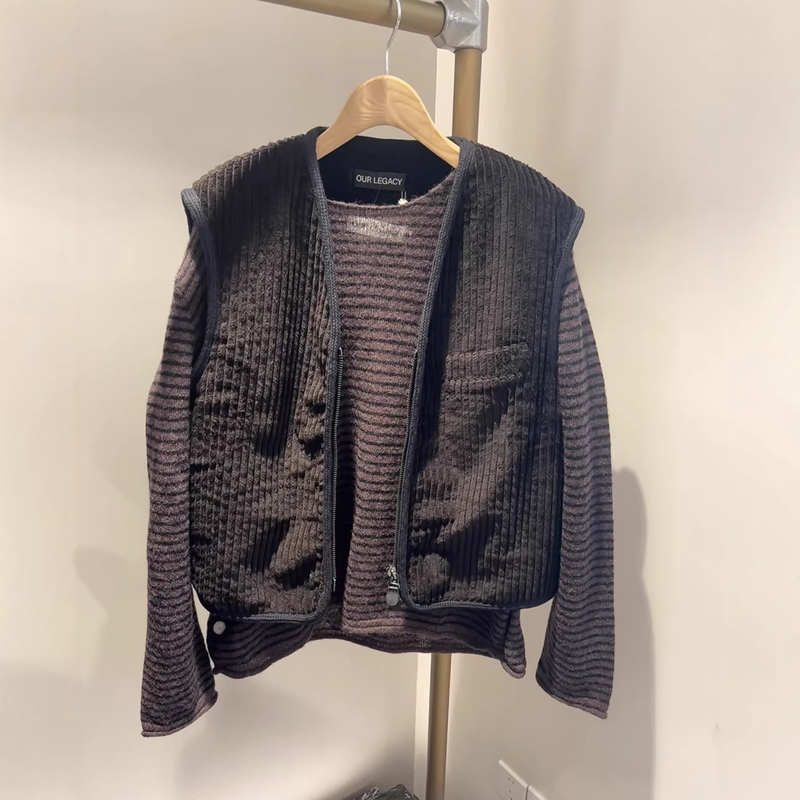Our风格深棕色复古条纹灯芯绒加绒短款马甲背心外套范丞丞同款