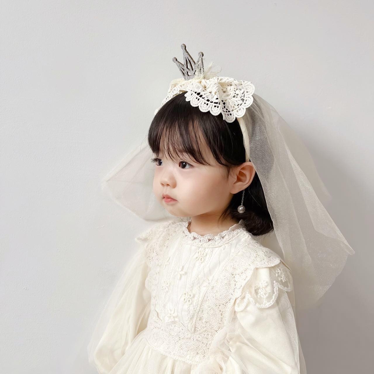 2024年の頭の糸の韓国版の復古のレースのスパンコールのクラウンの子供のベールの花の子供の誕生日の髪飾りの王女の頭の装飾品