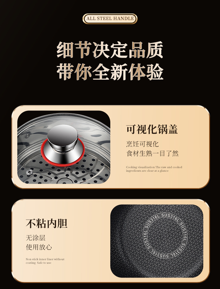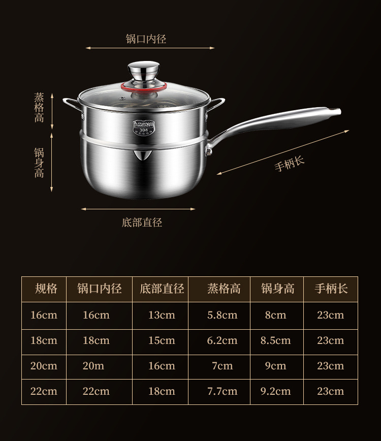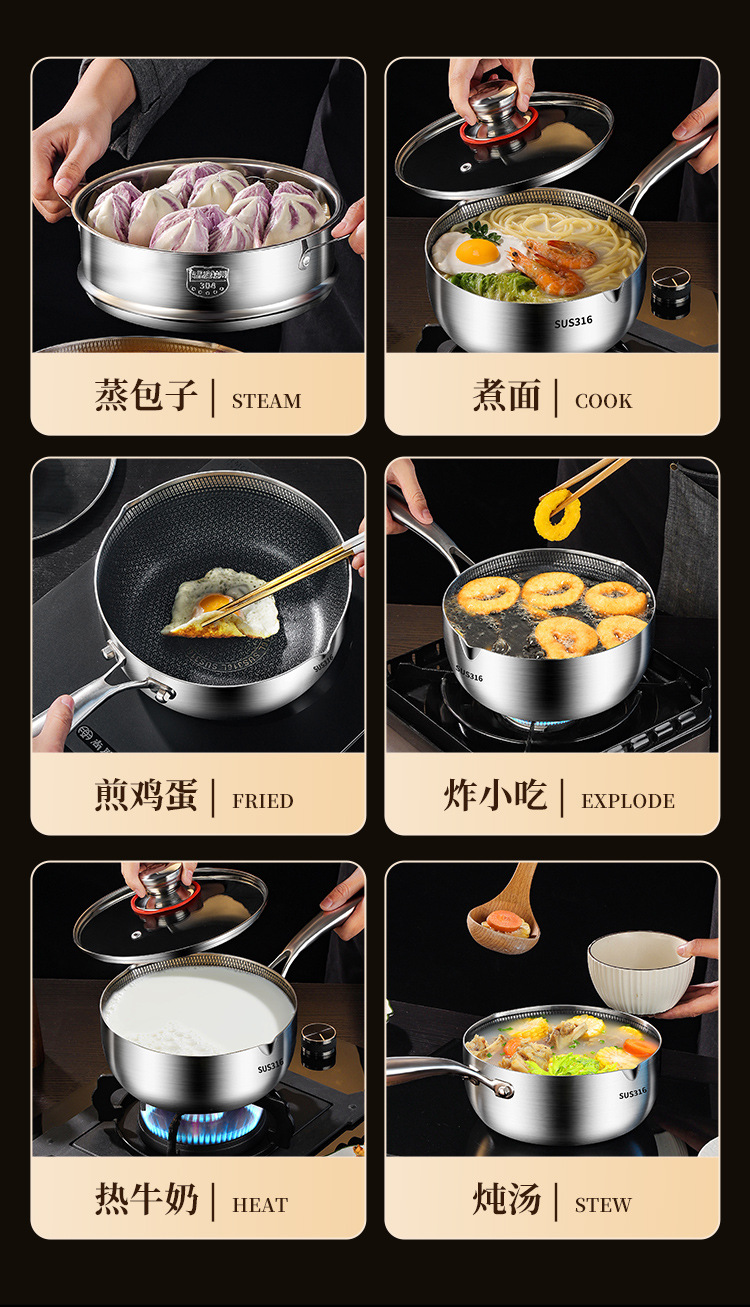 厚みのある 304 ステンレス鋼のベビーフードポット、小さなミルクポット、家庭用蒸し器、フライパン、オールインワンのノンスティックガス電磁調理器