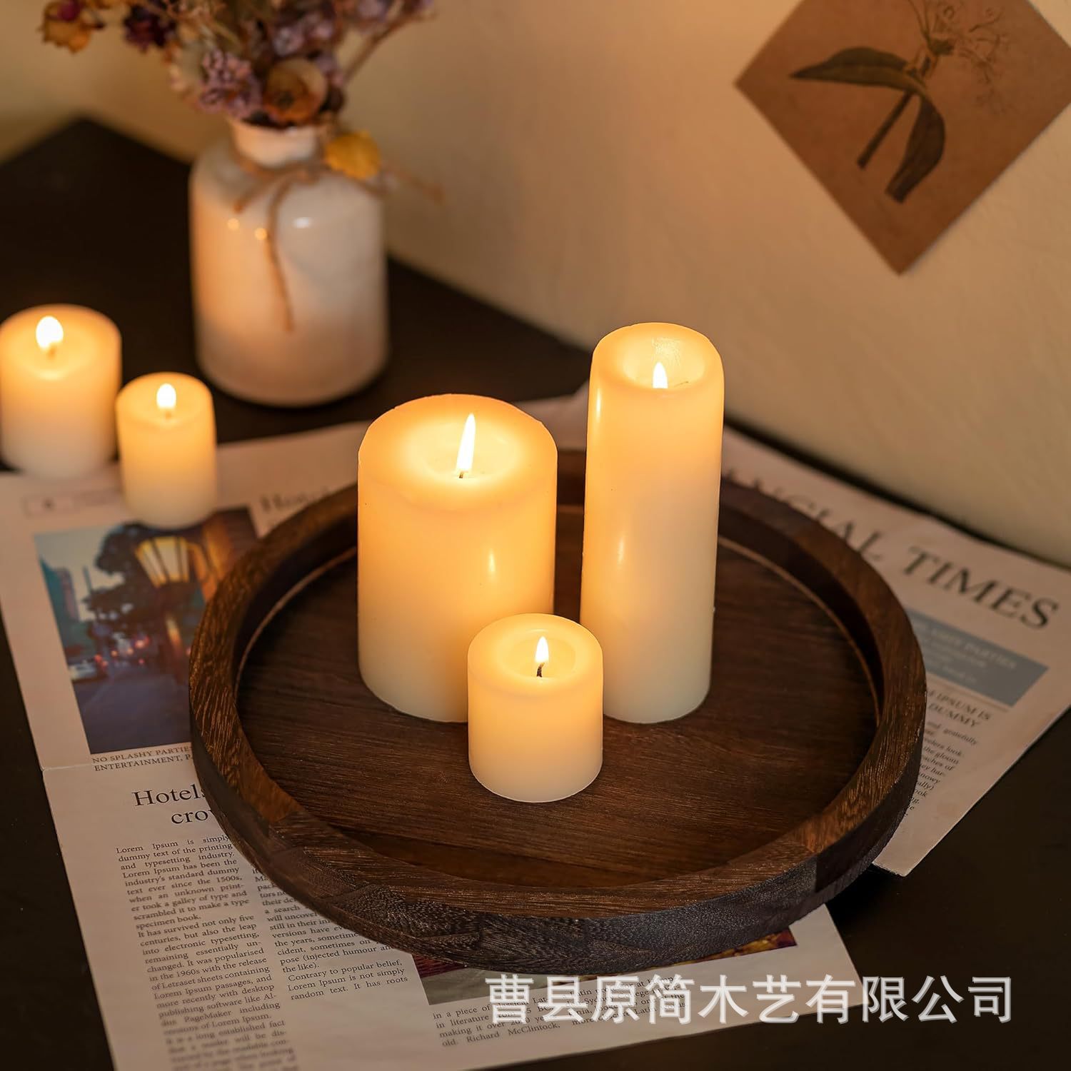 跨境实木蜡烛托盘装饰摆盘圆形复古烛台花瓶摆放托盘实木收纳盘