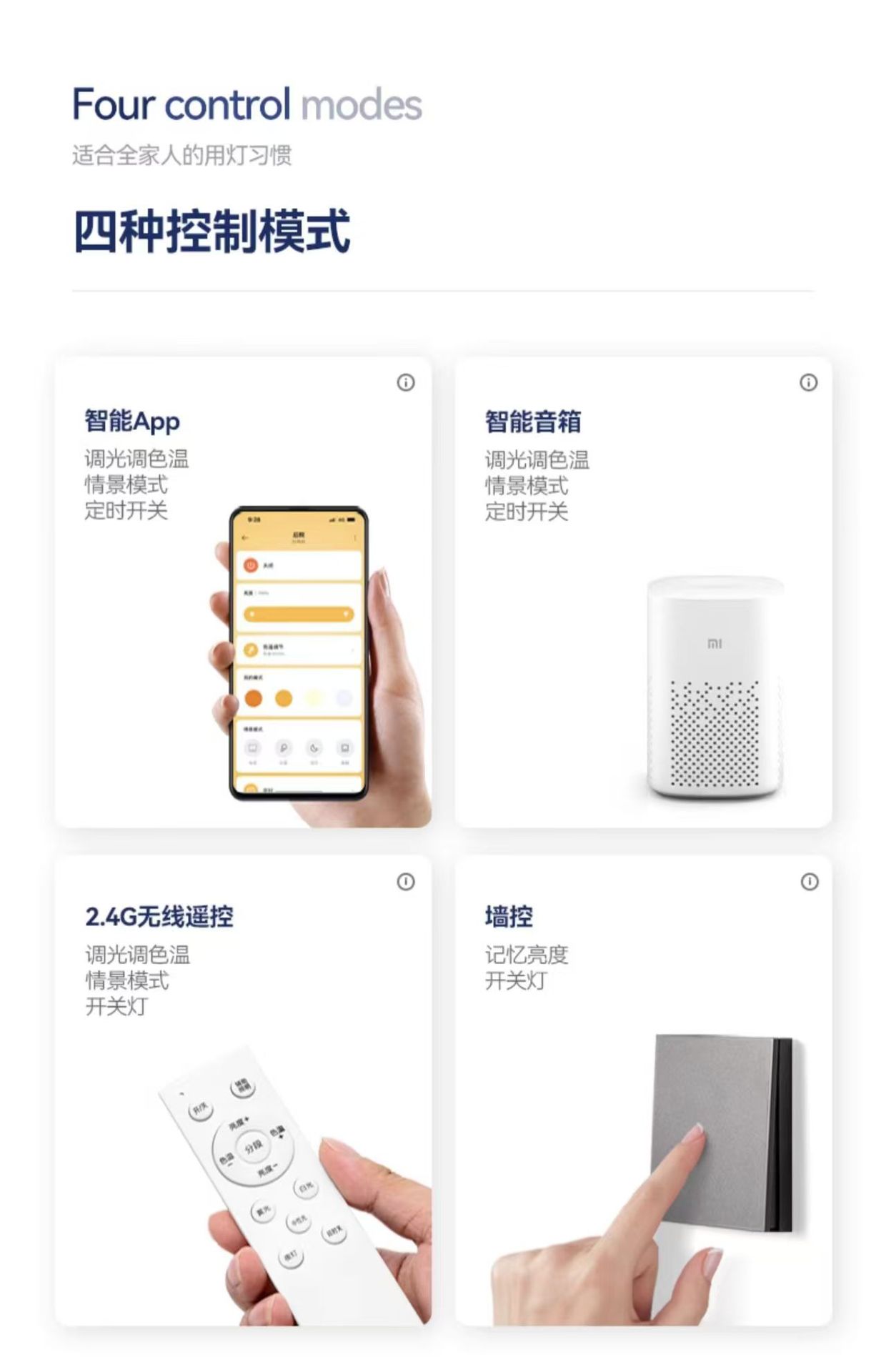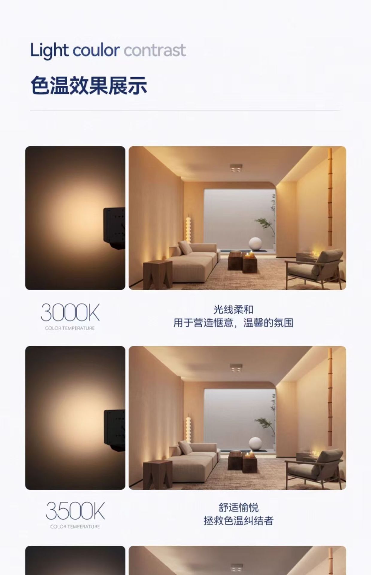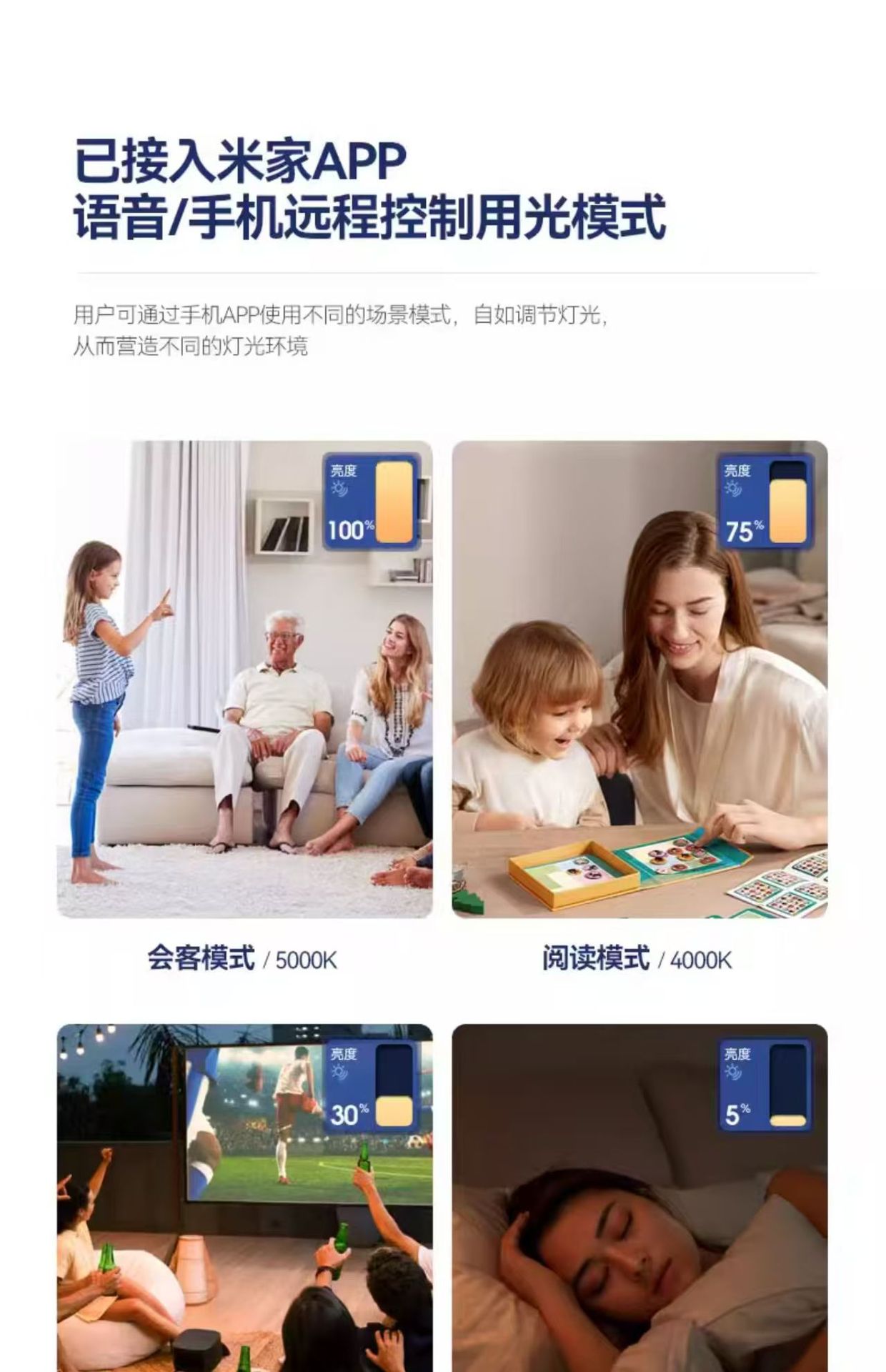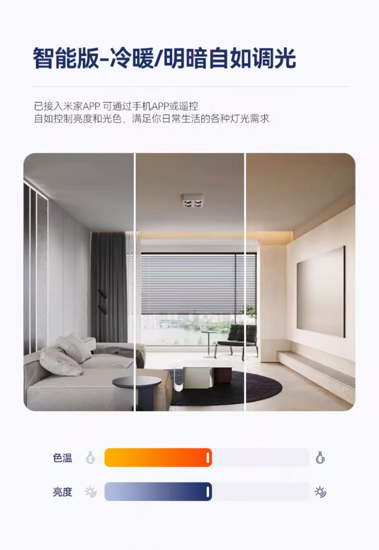 暖色系 3000K,ウォームホワイトトーン4000K,白色光 6000K,壁電気スイッチの色変更 3色調光モデル,インテリジェントな調光と色調整 - Mijia モデルへのアクセス