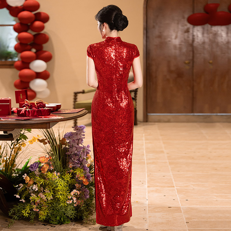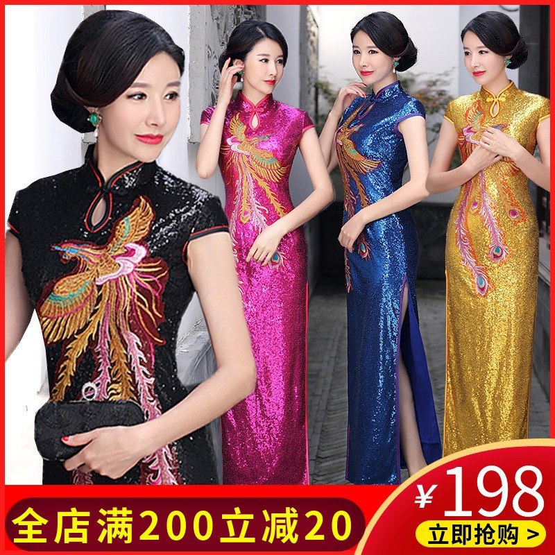 赤いスパンコールの鳳凰模様のロング丈改良旗袍2025年新作女性用儀式・舞台・キャットウォーク用衣装