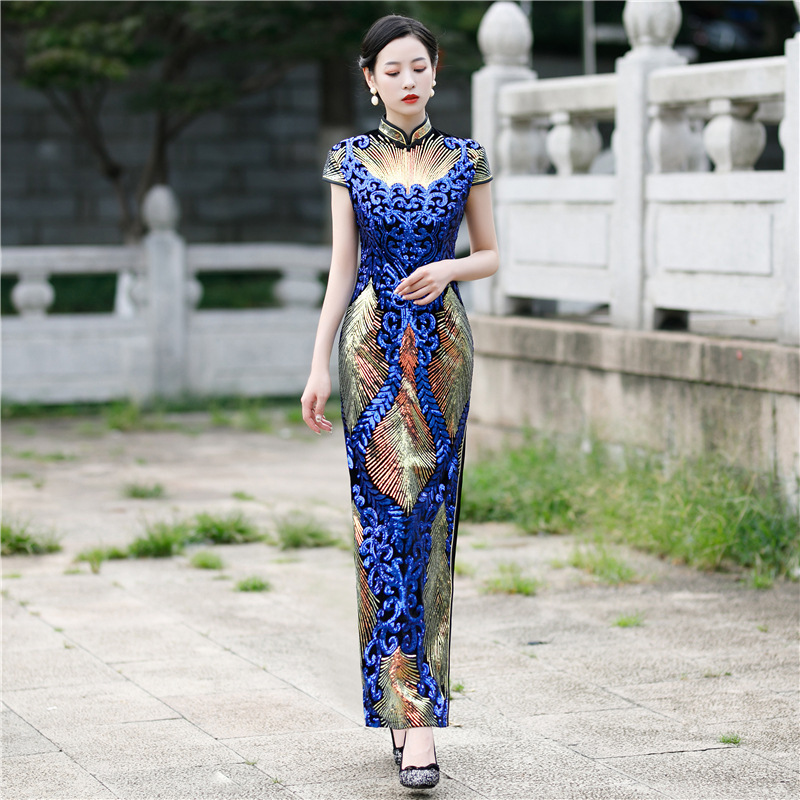 スパンコールベルベットのショーの国風中国式のロングタイプの改良チャイナドレスの若いタイプの女性レトロな修身高級感のあるドレス