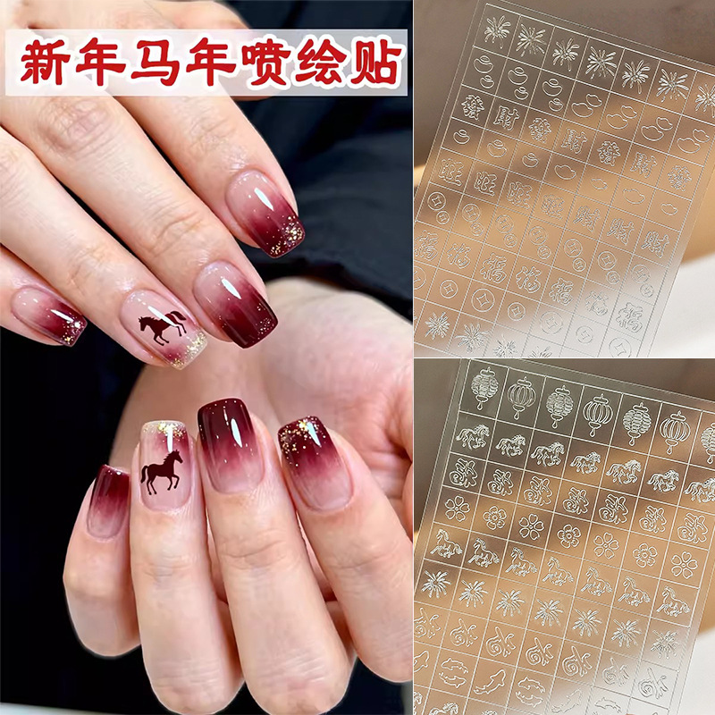马年新年镂空美甲贴纸拍拍喷绘渐变模板小马烟花发财元宝指甲贴纸