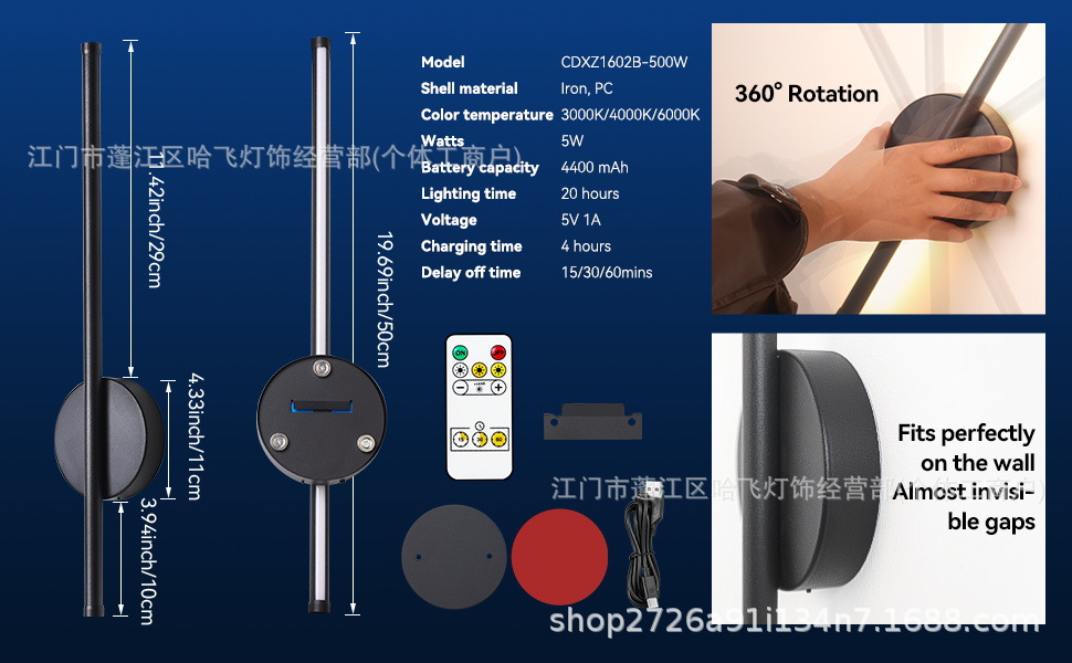 LED无线壁灯电池供电可充电壁灯卧室客厅浴室旋转调光壁灯工厂