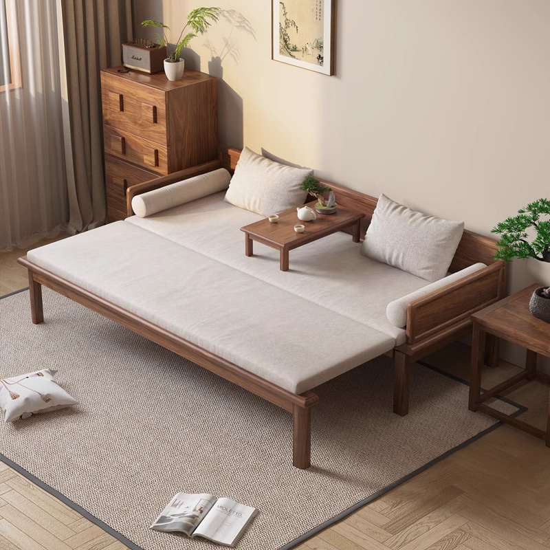新中国式黒胡桃木羅漢ベッド押し引き両用全実木三人位ソファー客間伸縮禅意ソファー