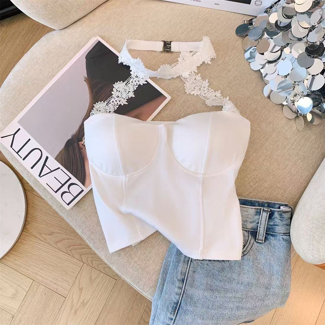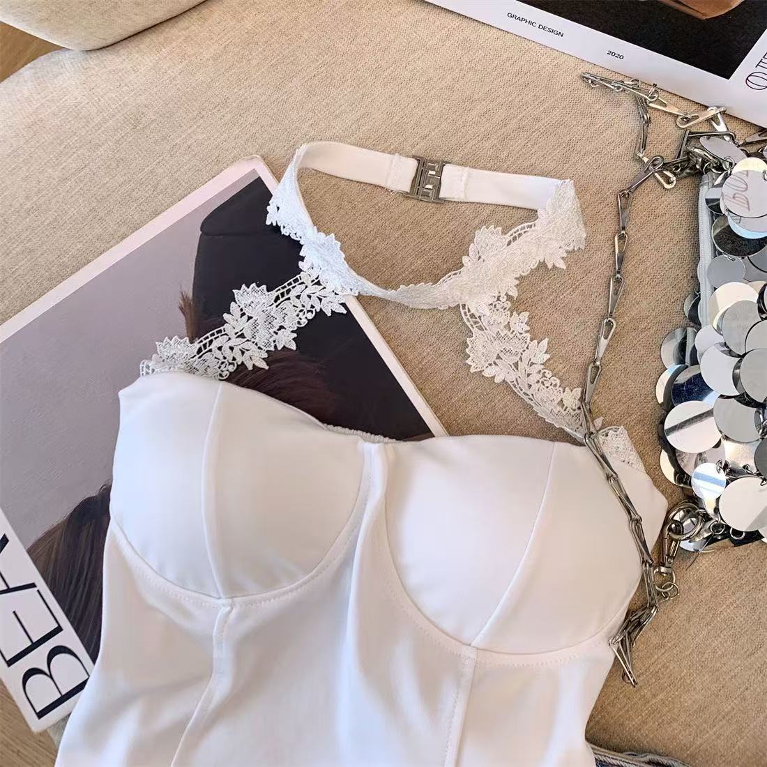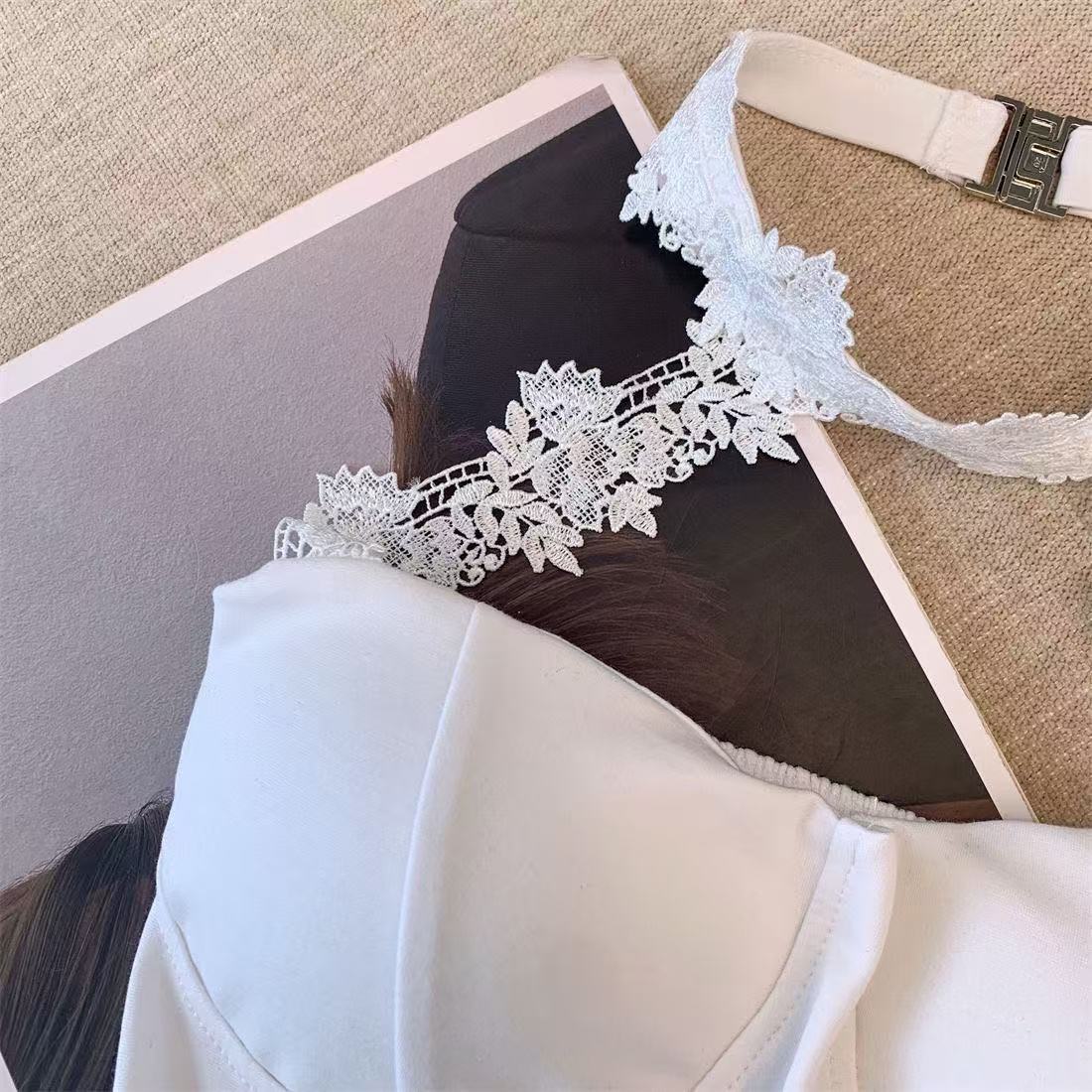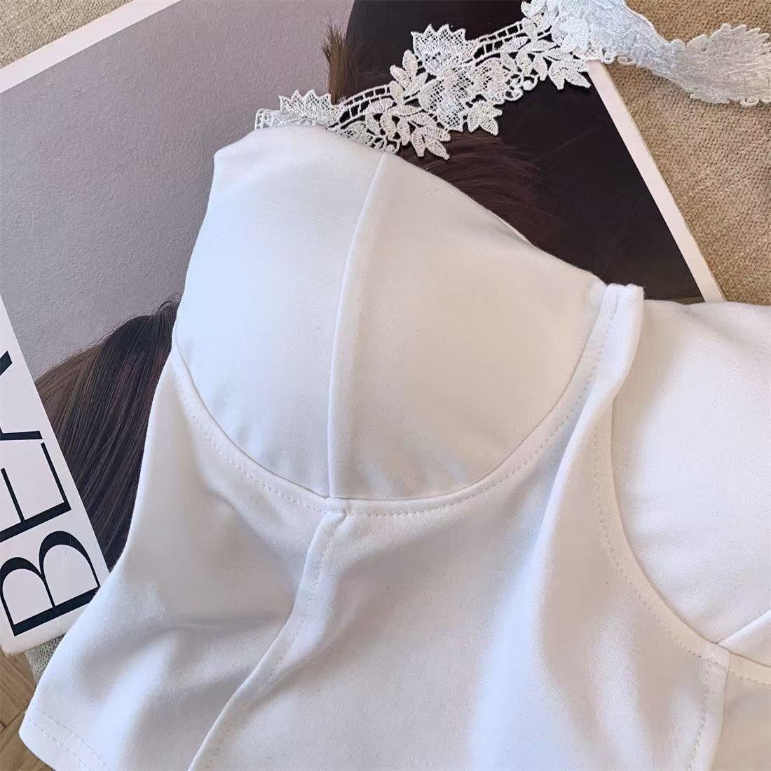 白いストラップベストの女性の夏のインナーには、胸パッド付きの蜘蛛の巣があります。