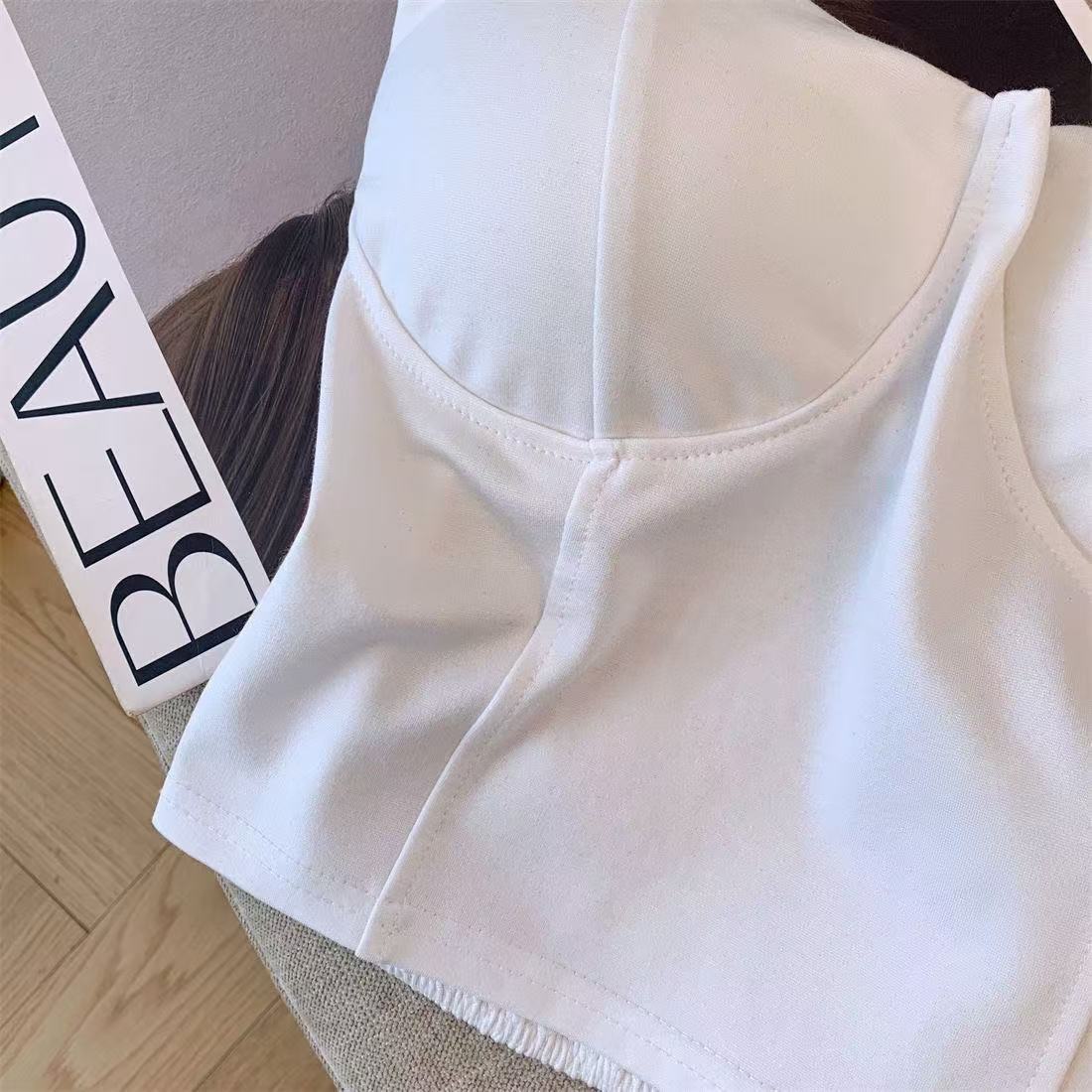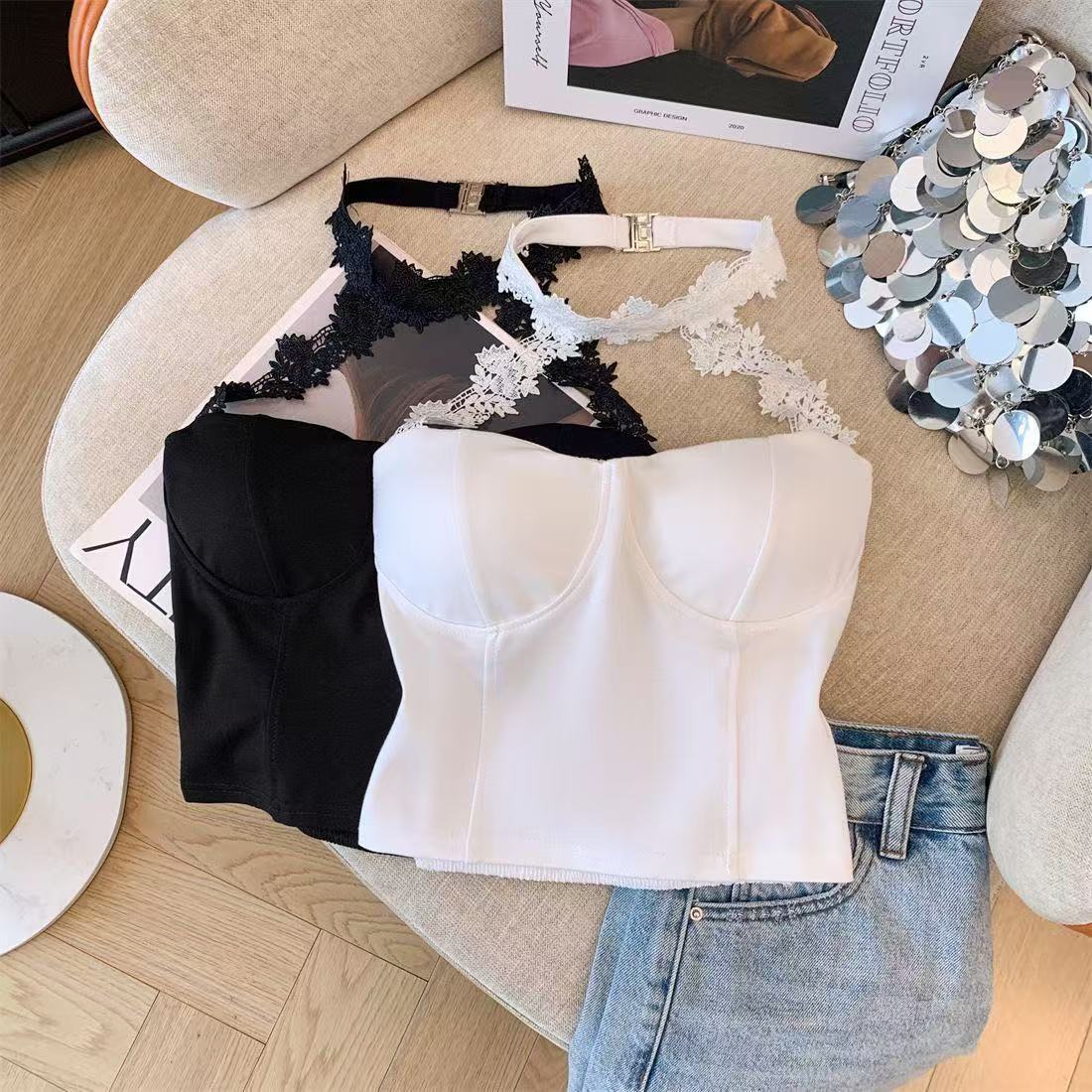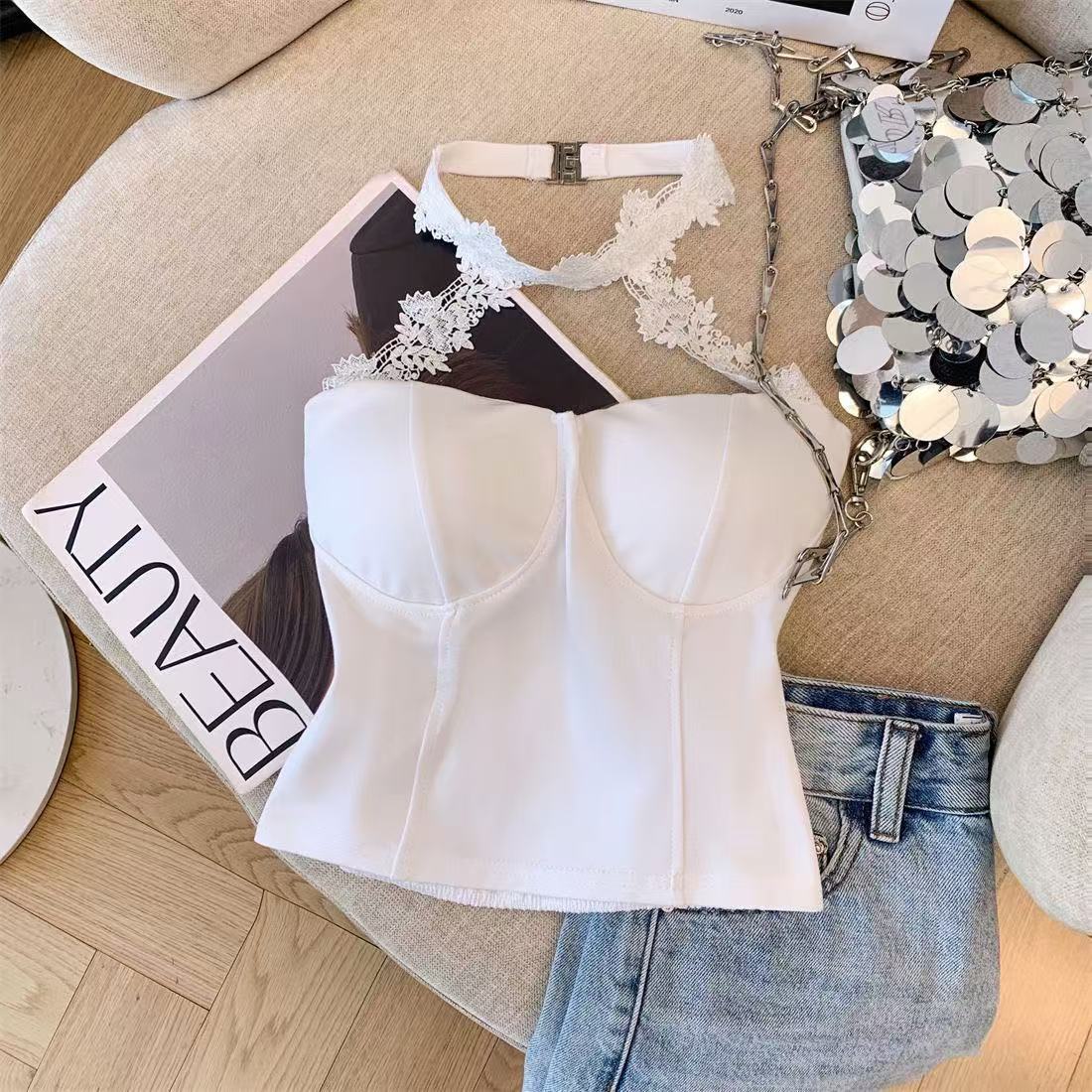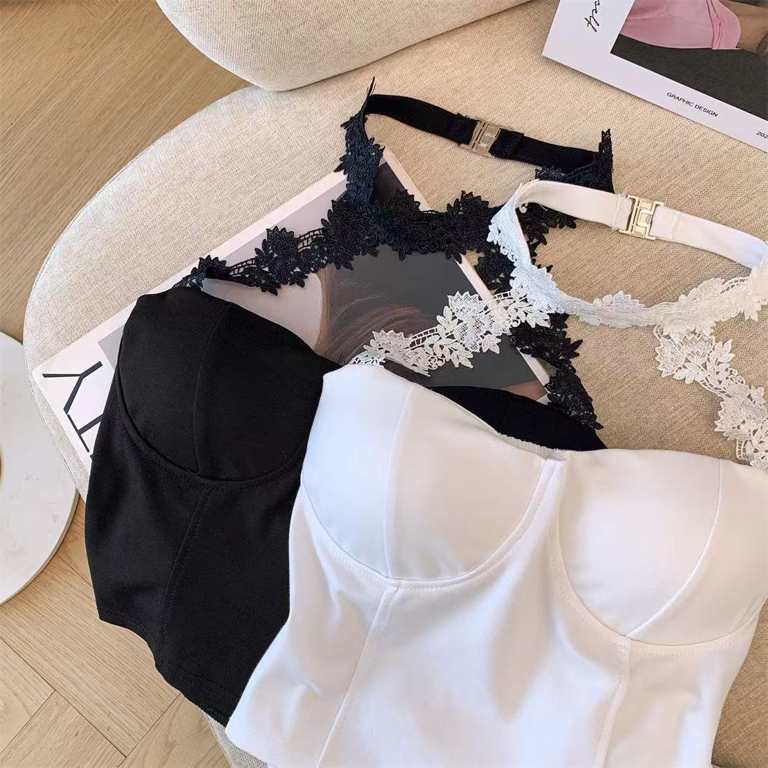 白いストラップベストの女性の夏のインナーには、胸パッド付きの蜘蛛の巣があります。
