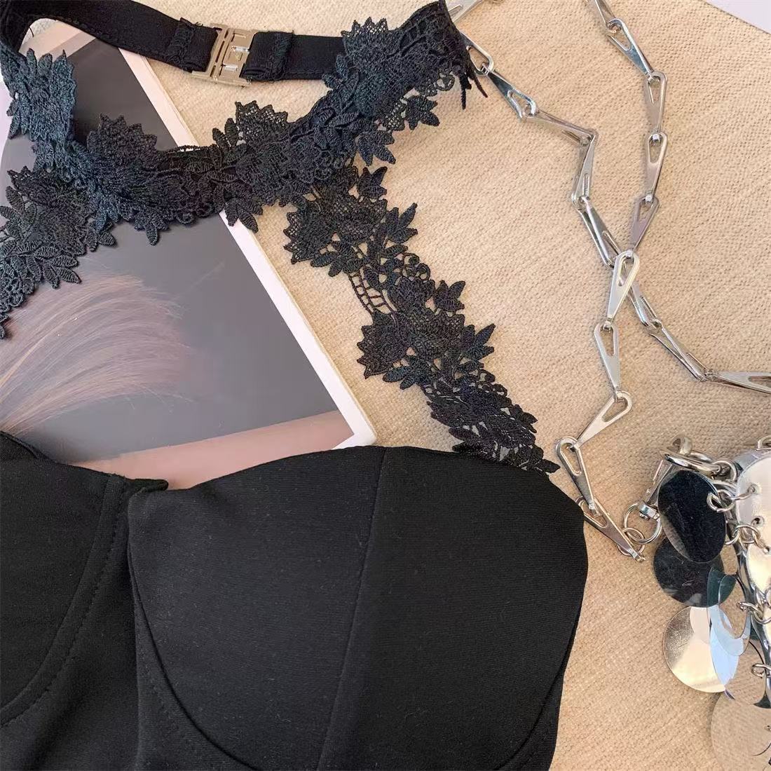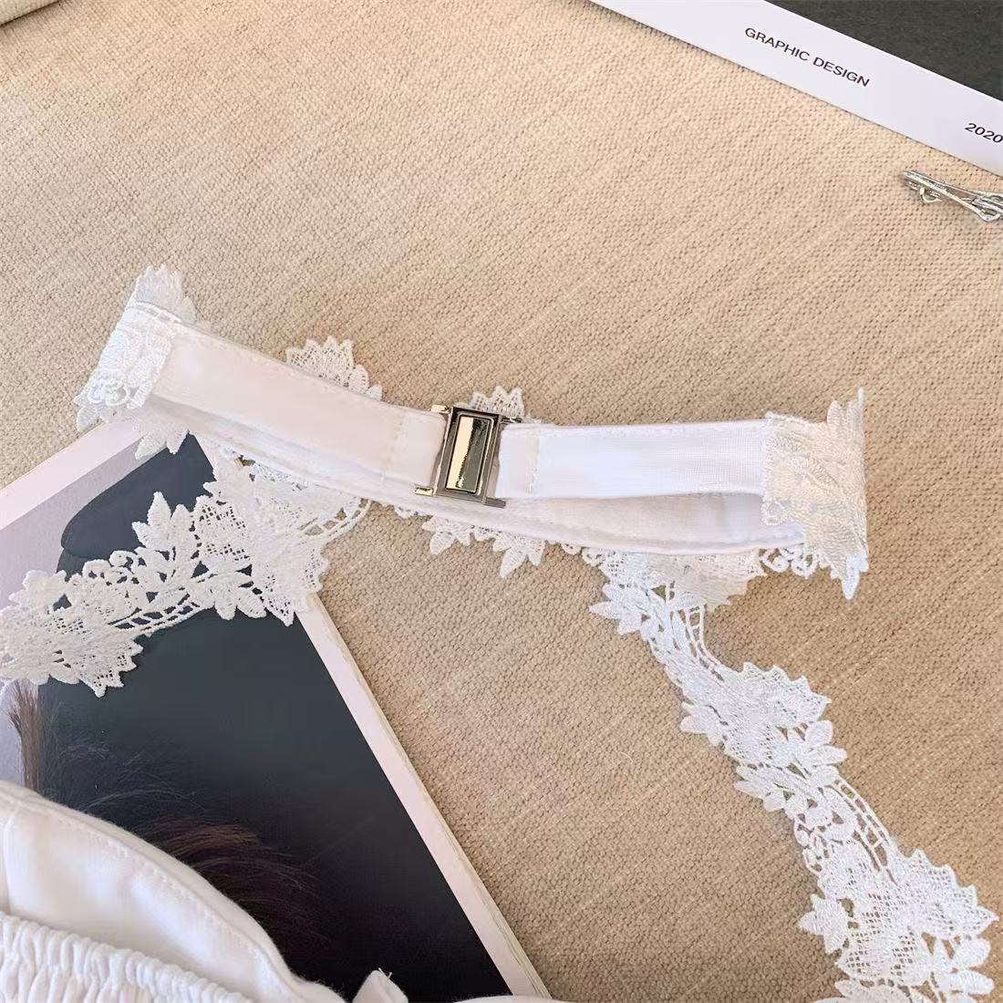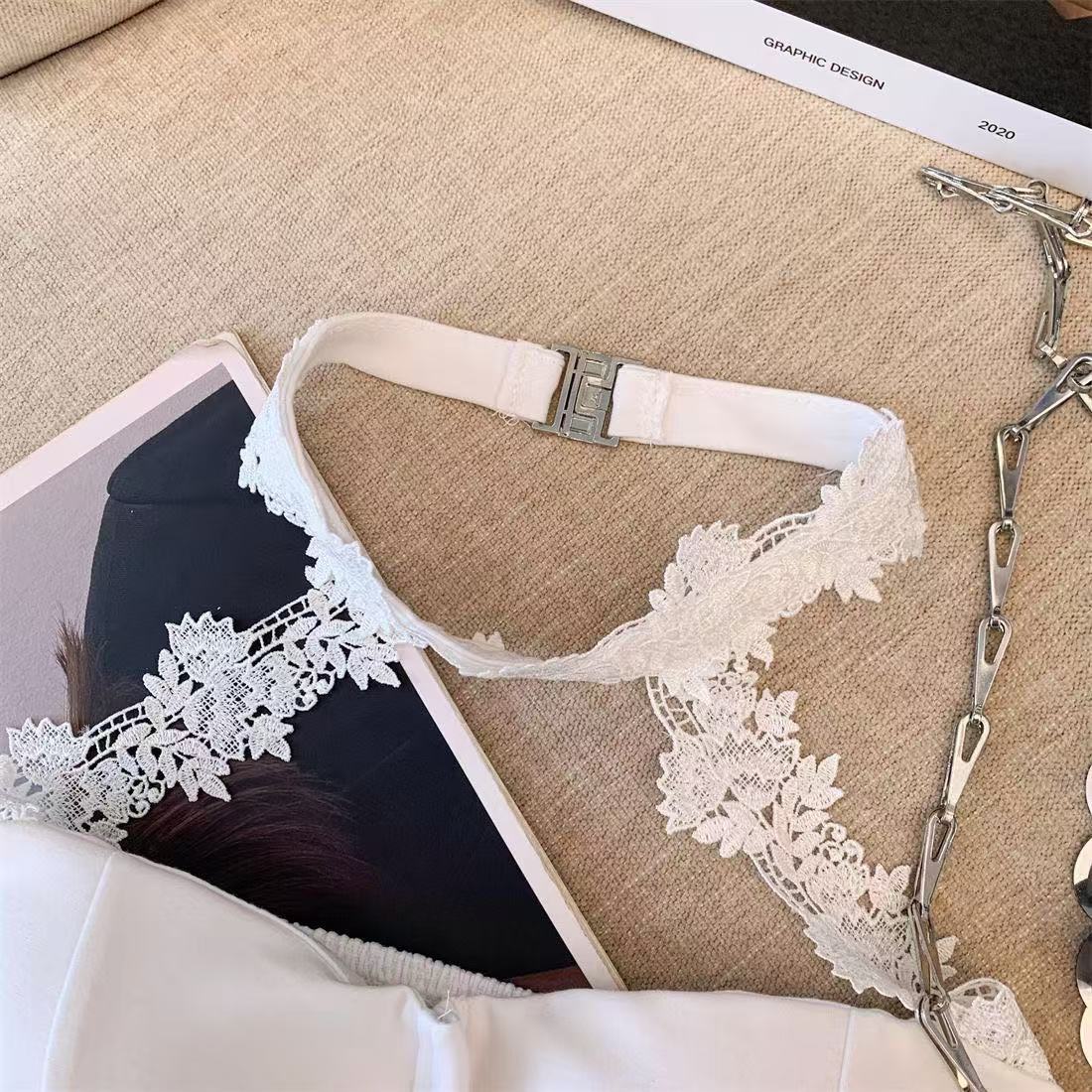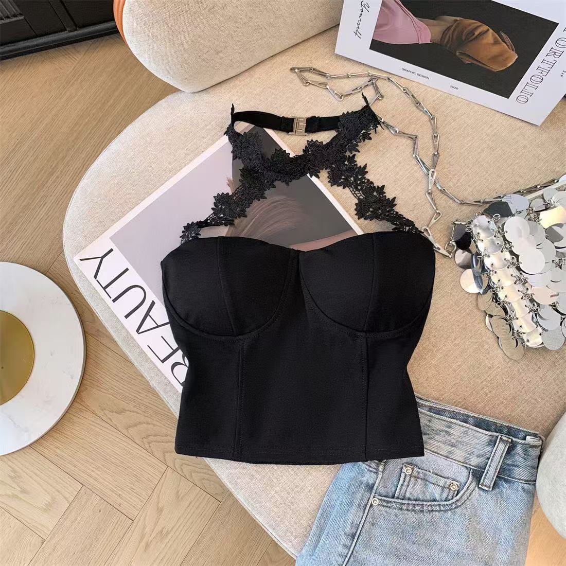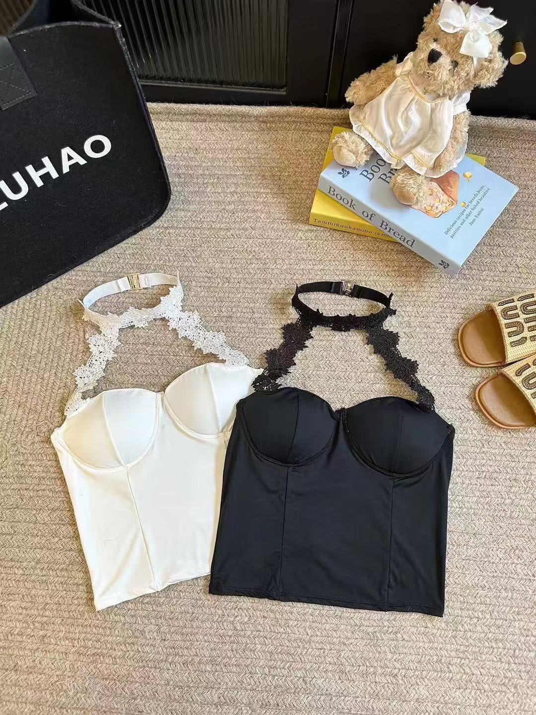 白いストラップベストの女性の夏のインナーには、胸パッド付きの蜘蛛の巣があります。