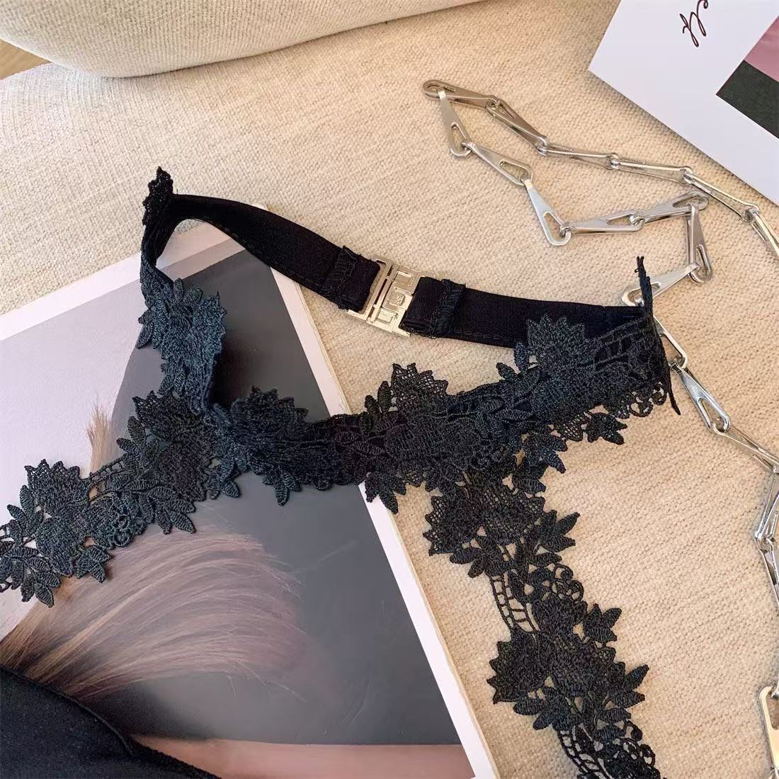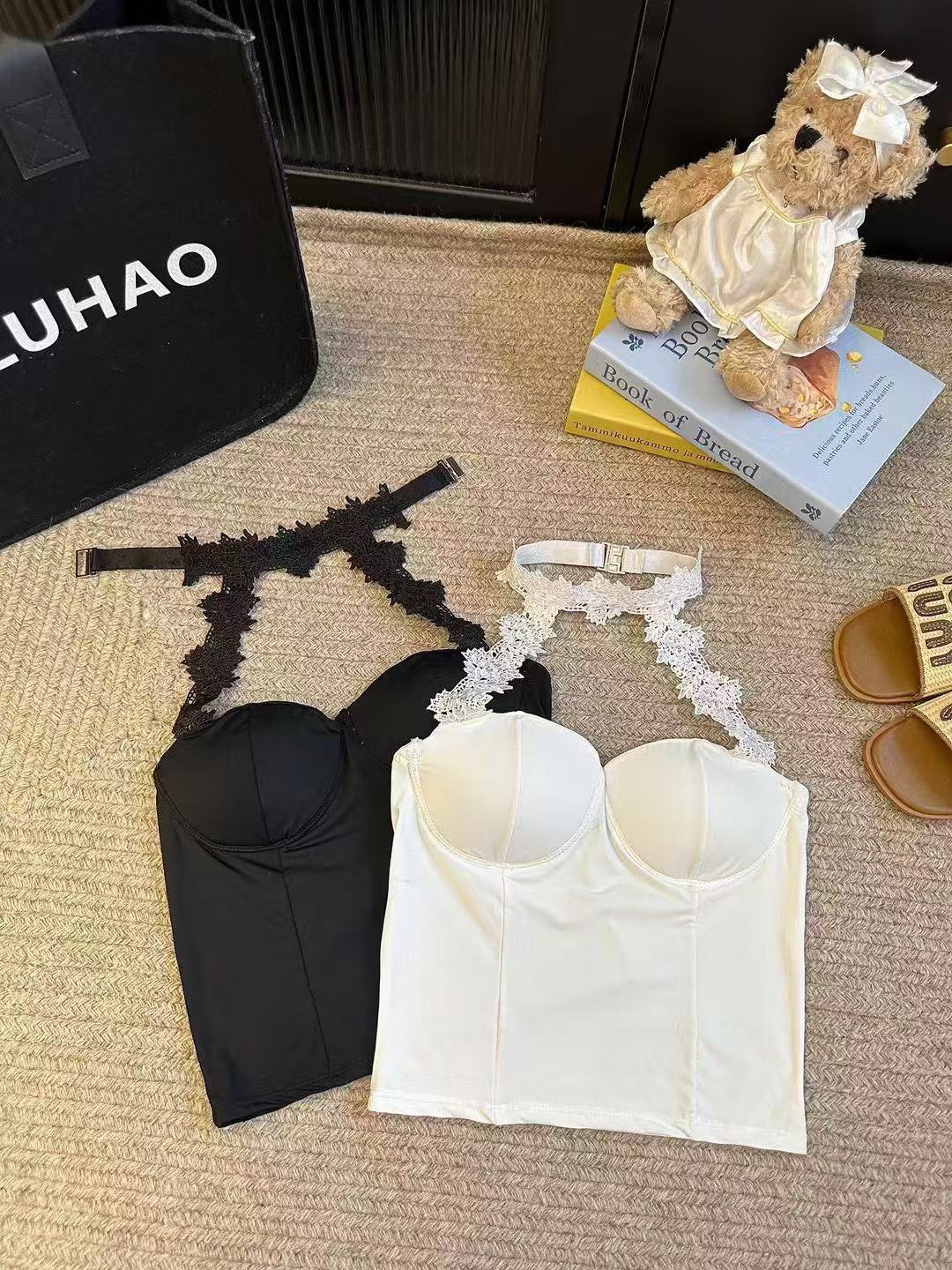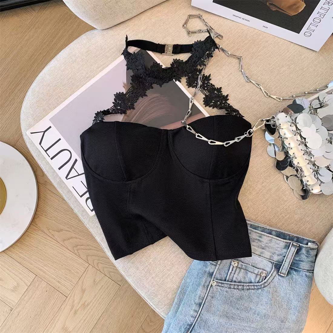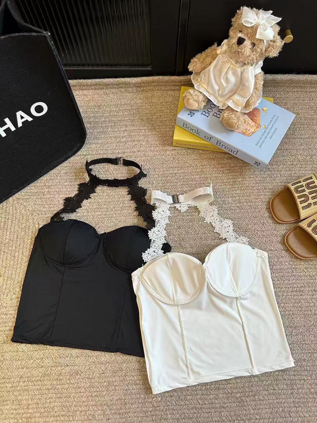 白いストラップベストの女性の夏のインナーには、胸パッド付きの蜘蛛の巣があります。