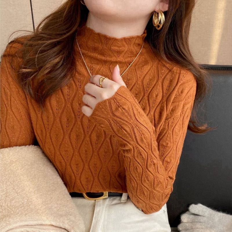 新しいレースの底のシャツの女性の春秋の半高襟の修身の気質のセーターの杏色の長袖のニットの上着