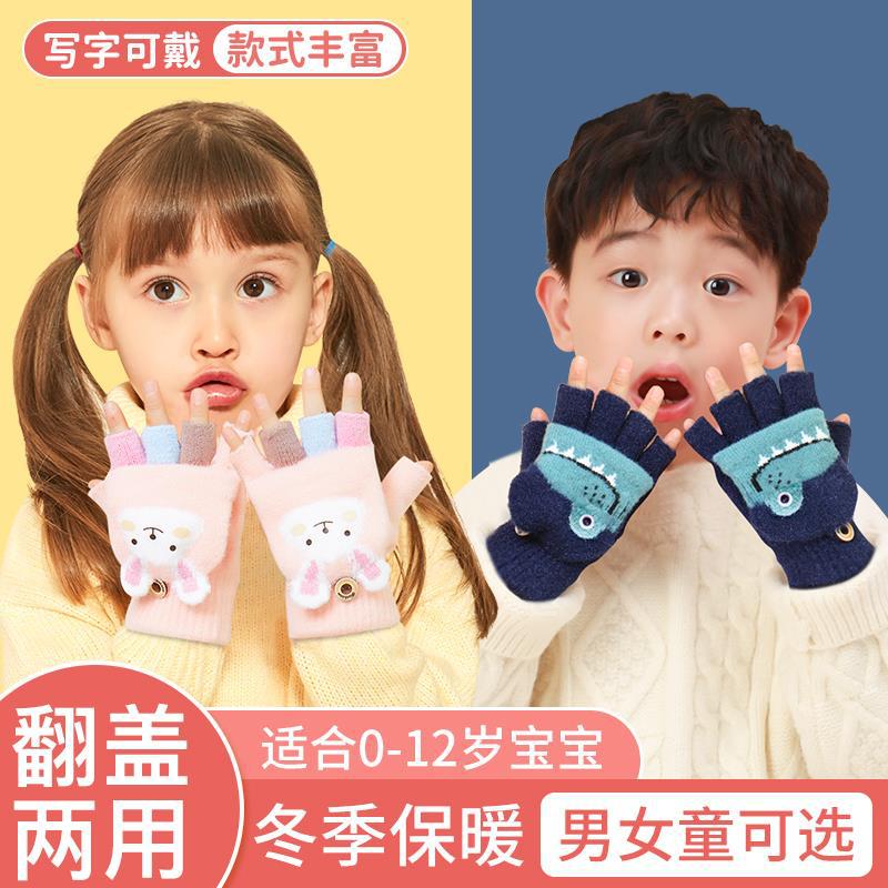 儿童保暖手套男女孩写字翻盖两用冬天小学生写作业五指防寒防冻手
