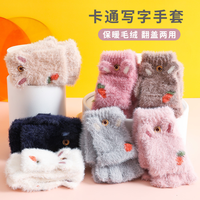 儿童冬季卡通兔子半指翻盖保暖手套男女童可爱加厚毛绒露指手套