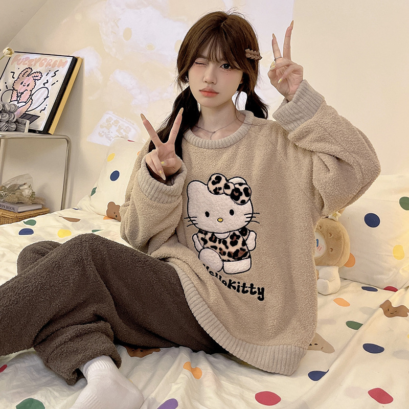 クラウドコットン漫画キティパジャマ女性の春と秋の長袖インスタイル日本のかわいいチェック柄夏のホーム服
