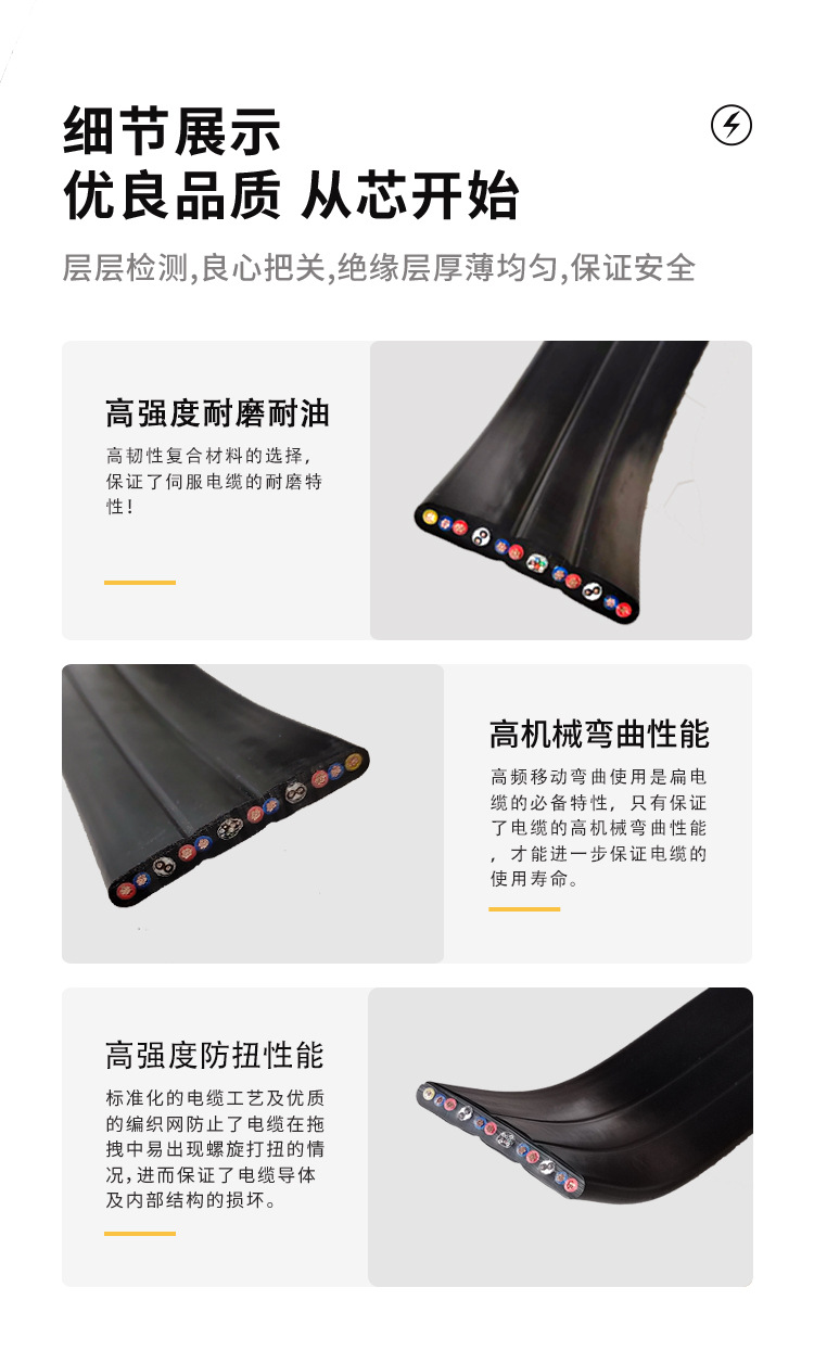 適用範囲 複合フラットケーブルは、エレベーター昇降システム、自動生産ライン設備、インテリジェントな保管および取り扱い設備、医療機器などに広く使用されており、通信を安定して伝送できます。