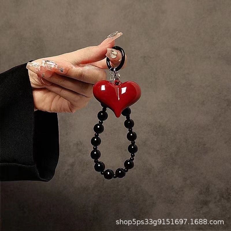 パーソナライズされたクリエイティブな赤い愛の黒ビーズハンドチェーンリストショートストラップ携帯電話ケース車のキーホルダーバッグペンダント