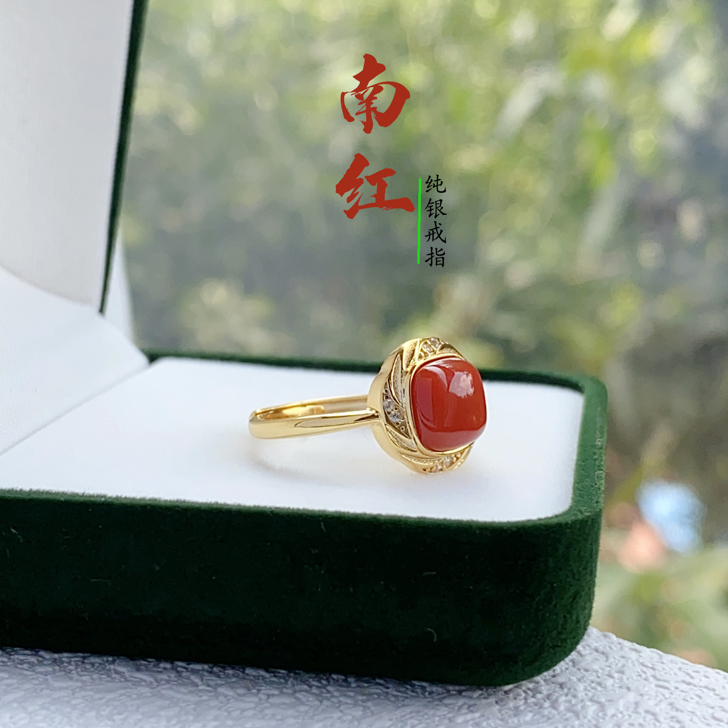 天然南紅リング S925 シルバー象嵌柿赤南紅瑪瑙角砂糖リング女性用鑑定書付き